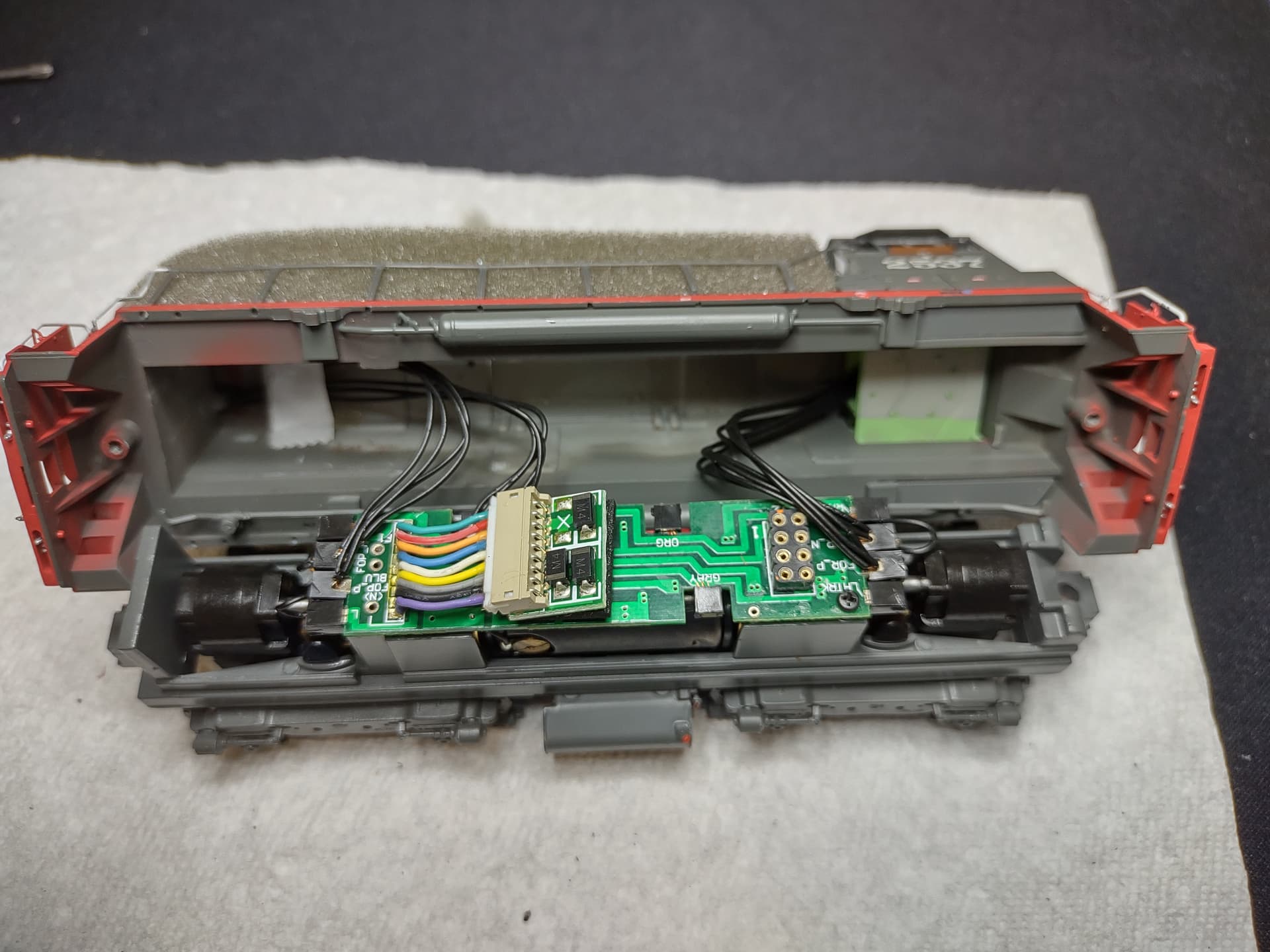 I have the same locomotive, but mine accepts a 21 pin decoder. On mine, you remove the top cover on the hood, pull off the dummy board, and plug in your decoder. Yours may or may not be the same, or similar. First thing to check is whether that top cover just slips off on yours. If so, it’s easy. You don’t even have to remove the shell from the chassis.