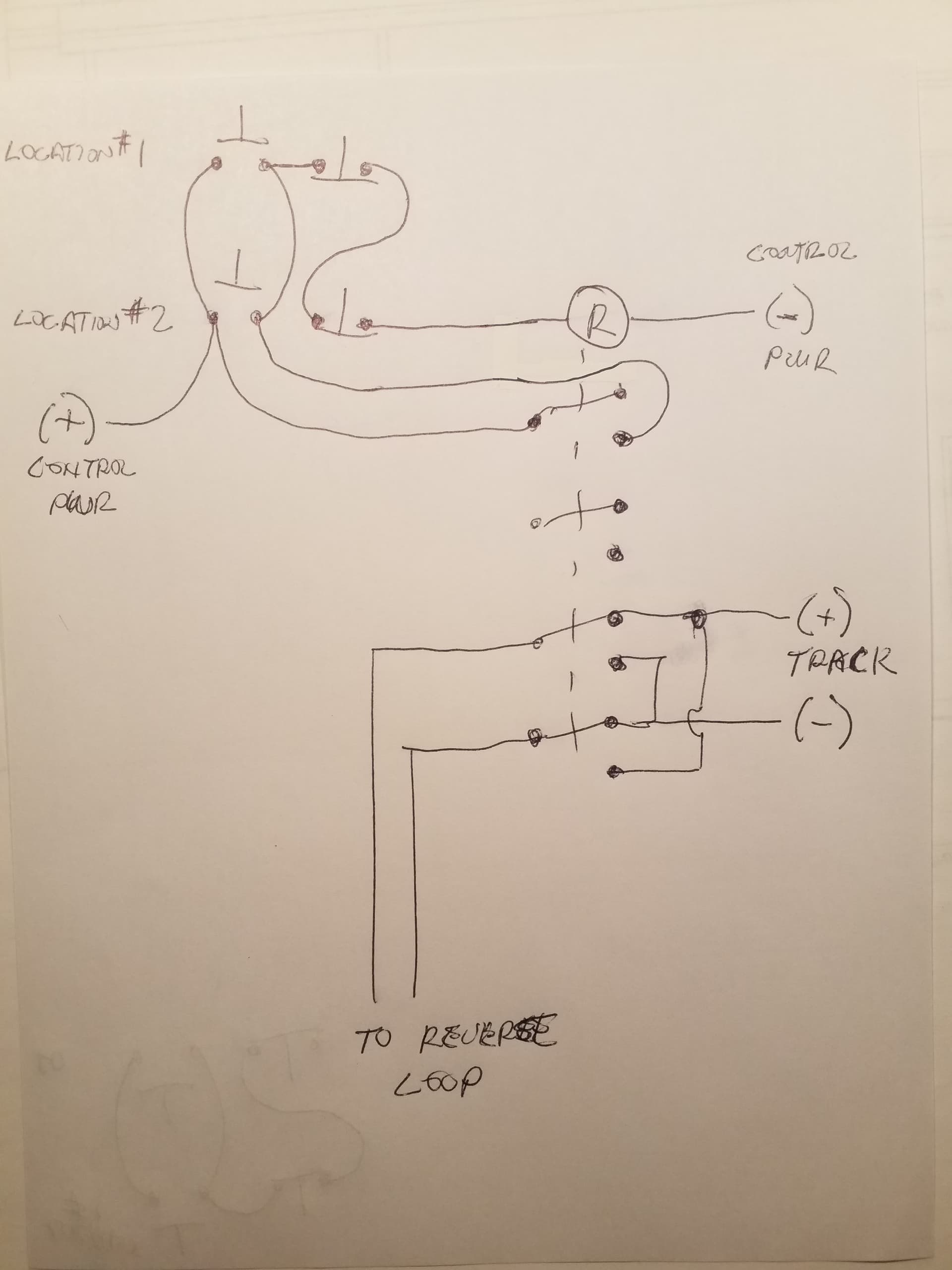 i think the following is correct. one button at each reverse section entrance. one energizes the relay. the other button releases the relay.