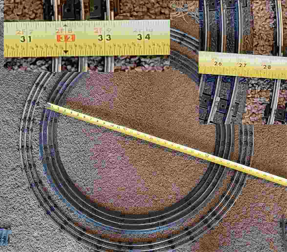 The dimensions - Marx track on plastic roadbed O-27: rail height 3/8", straight pieces 8-7/8" long, curves form a 26-7/8" circle, 3 rail ties per section, Listed as O27 in Marx instructions. Marx track without roadbed O-34: Rail 3/8", straight 11-1/8" , Curves form a 33-1/4" circle, 5 ties per section, listed in instructions as O34.