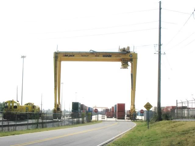 This view shows on end of the yard with the other crane barely visible on the far end. To the left is the engine track then the one loading-off/loading track and the stacks of containers on the right.