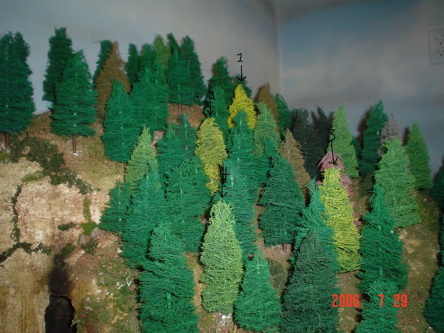 I did some experementing with my tree color, I took some and added some shades of yellows. I have them numbered 1-4 (kinda of hard to see) please help me with these, do I need lighter or darker or just a different green. I am using Wally World $.44 craft paint. what should I do? I admit the colors are not right (to green). If anyone knows about these paints please specify which ones would look right. I have never seen another layout in person except for my own, and admit I do not know what I am doing. Forgive me for being such a bother but would like to get these right. Thanks so much. Mike