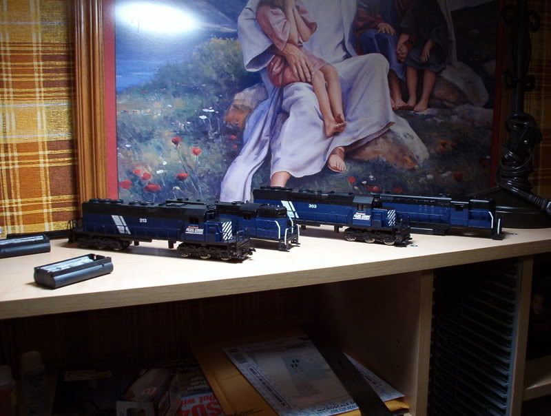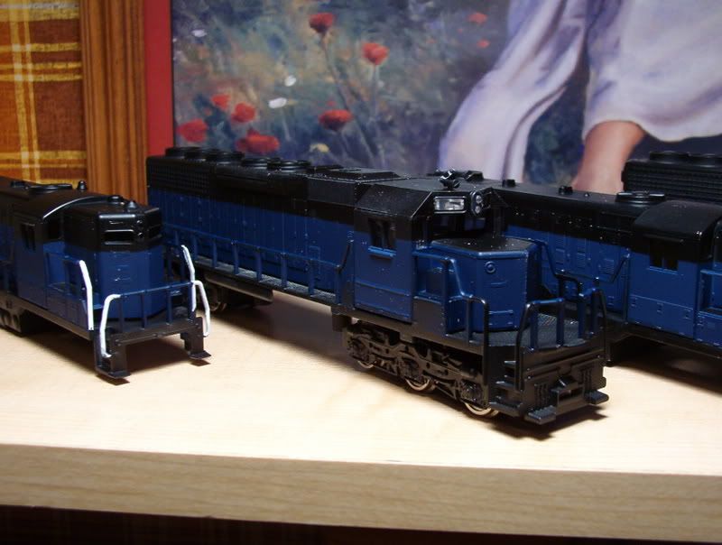 Here is a couple of pictures of my work in progress. these are two SD40s from AHM that I received from my grandfather some time ago, and two Geeps from Bachmann as well… I’m using them to practice on. Tell me what you think. I’m at the point of applying decals and I need to hear from you guys what the best way to get out the airbubbles. Remember, they aren’t finished