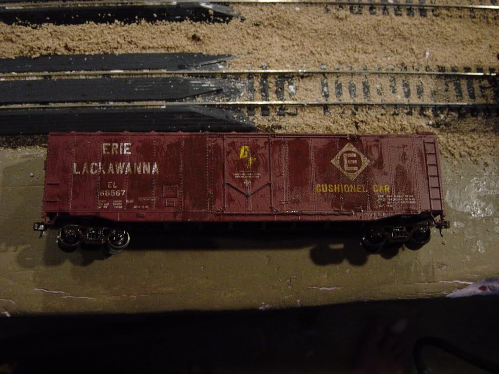 Drybrushing! This is the number 1 tool in your weathering arsenal. I usually use a nice grime color, like grimy black or dirt (polly scale paints) and drybrush streaks down the sides of the cars, the trucks and couplers perhaps? Streaks under the brake wheel, maybe some streaks of rust here and there? I will lightly drybrush a rusty color on the corner steps, or sometimes on larger areas, depending on how nasty the car is.