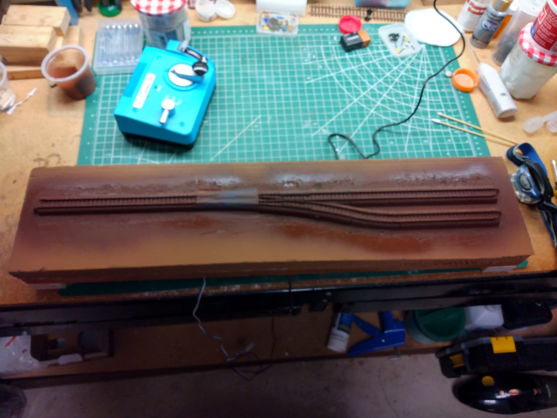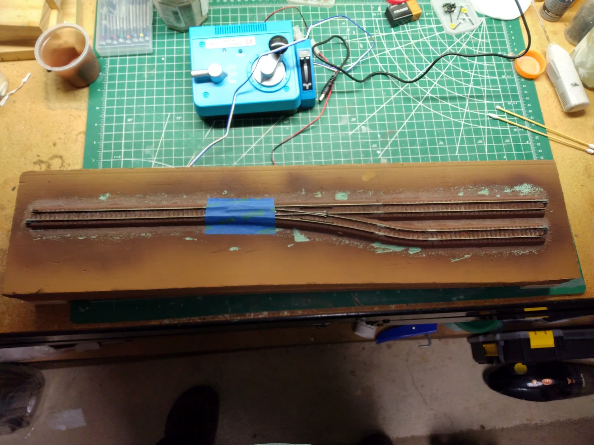 Photo 5: The cleaned turnout placed back on my test track. Notice I have covered the points with tape to protect them from the Tamiya Nato Brown spray paint. I decided to re-spray the test track because some of the paint was scrapped off when I removed the ballast.
