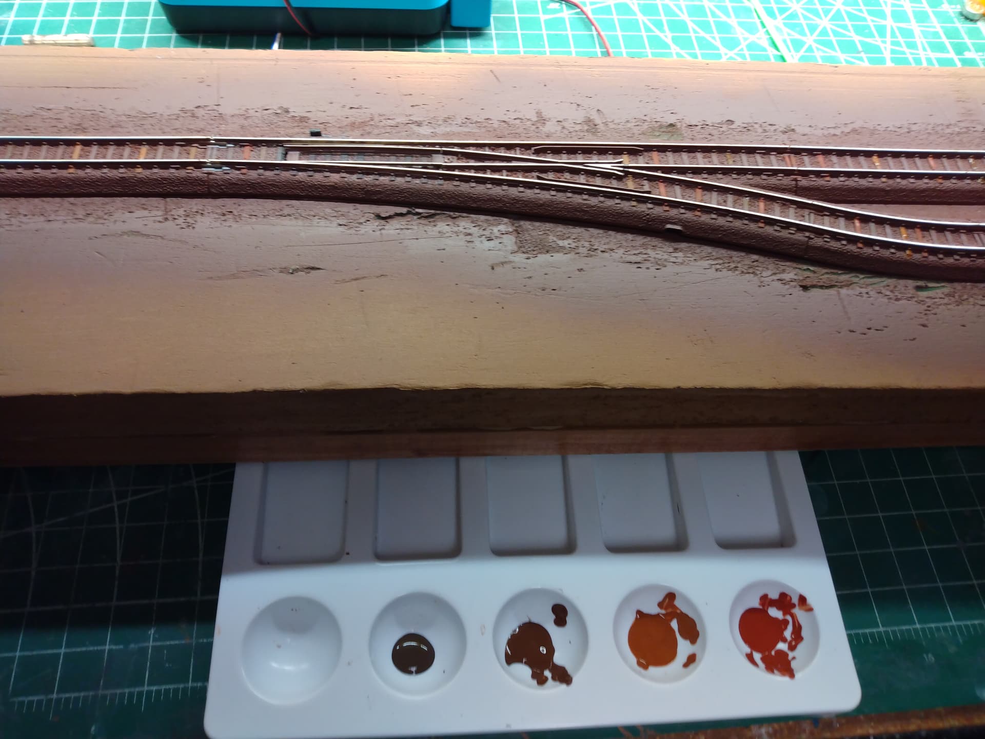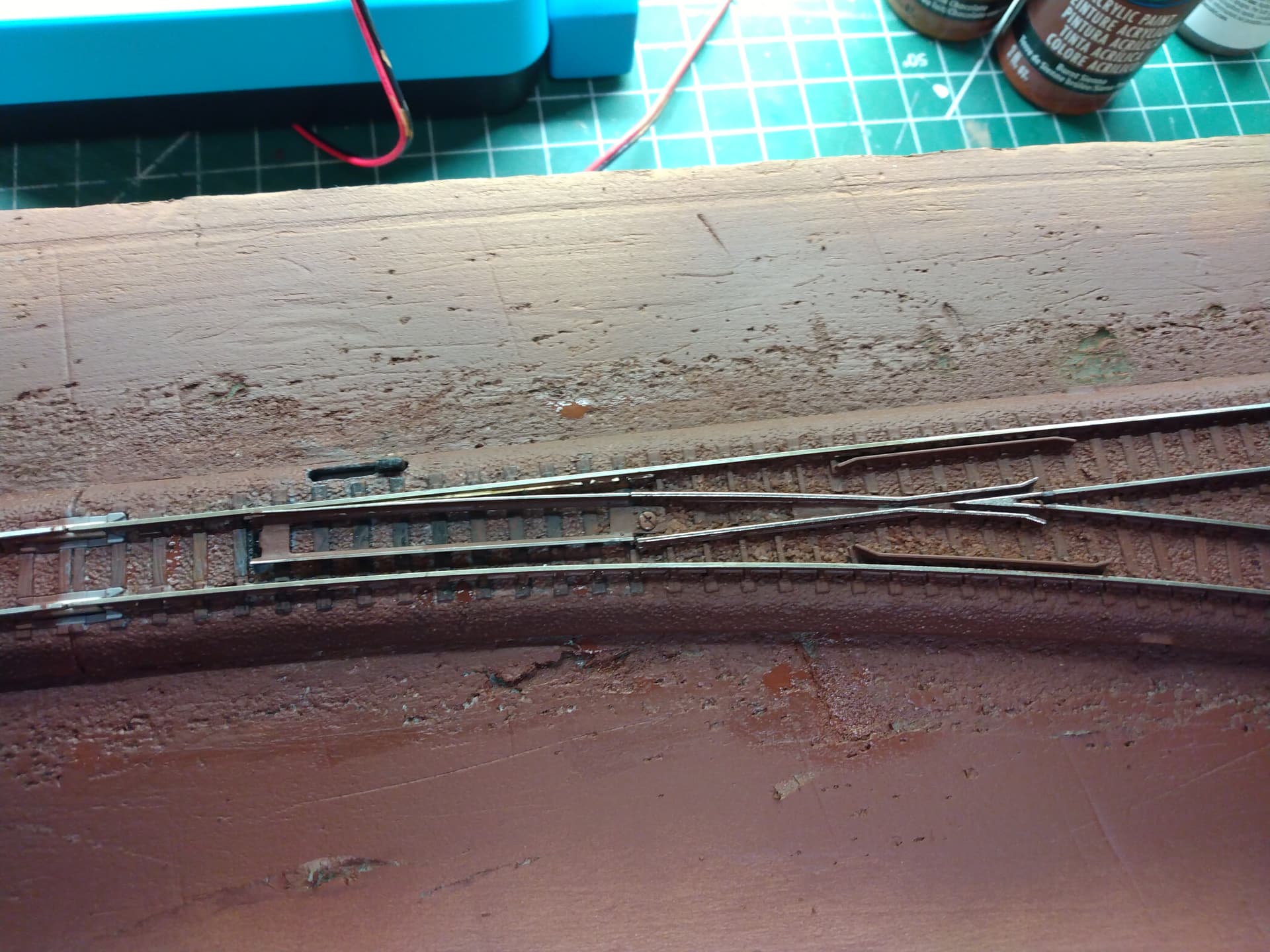 On my next test, I will tape nearly the entire turnout to make sure this does not happen again. Once the rest of the test track is painted and ballasted, I will remove the tape and very carefully hand paint near the points and apply ballast to the sides of the turnout. I will frequently test the mechanism to make sure it keeps working.