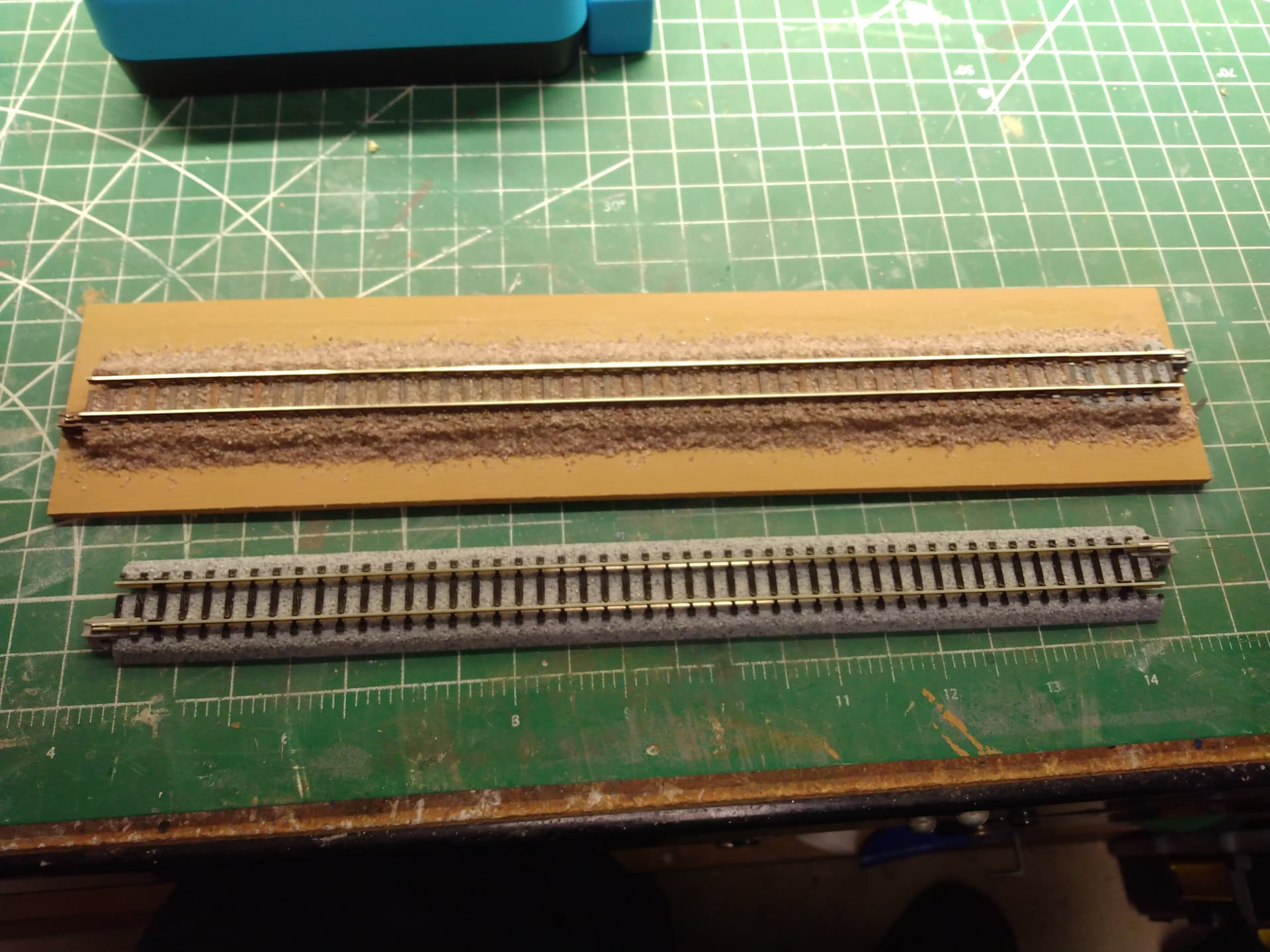 As I mentioned earlier, it is easy to ballast straight and curve track even if the Kato ties are embedded in the blastic roadbed. There is still about 1/16th or 1/32th of the ties sticking up. It is simply a matter of carefully spreading a thin layer of ballast between these ties. I know some do not bother to ballast between the Kato rails, but I found it not to be challenging. I used the same approach to ballast the Kato Unitrack as I did to ballast my HO layout track.