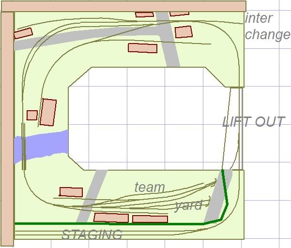 If you are certain that this is the space available, keep working with options which may address some of these potential difficulties. How about a bent “figure 8” on a slightly elevated grade where trains could run continiously INSIDE of the outer loop, then connected to the line that is closer to the table-front where you have the spurs and switching and town?