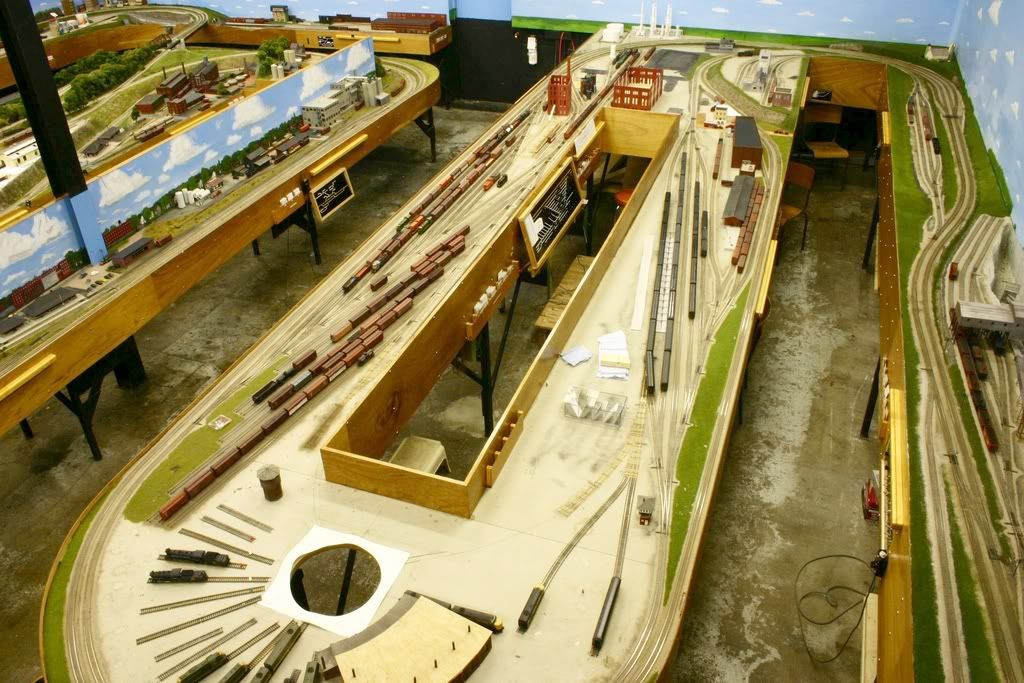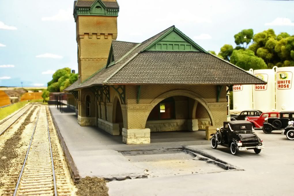 Very nicely detailed layout, especially for a club layout that large. I really like that stone station too although I hope someone fixes that big hole in the pavement before the Model A falls in. [:)]