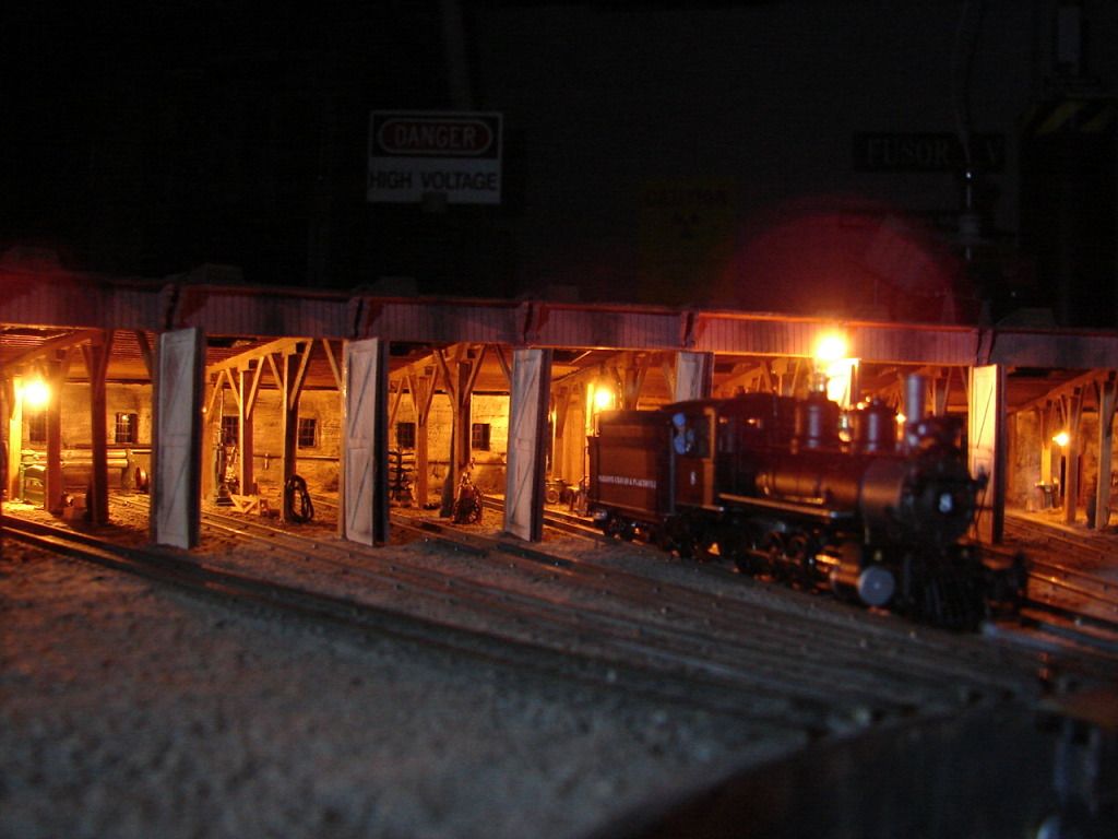 Her is the Durango roundhouse at night. The incandescents give a nice warm tone in the roundhouse and a distant, ( 8 feet away), single ultra bright white LED gives a moon light cast outside the roundhouse.