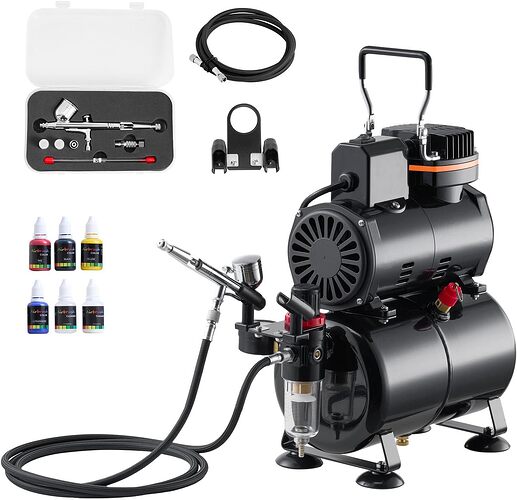 That’s a pretty solid set up you got there. As for paint a lot of people like Vallejo Air and Tru-Color for air brushing. I recently got an airbrush from Harbor Freight myself and am looking to try it sometime too.