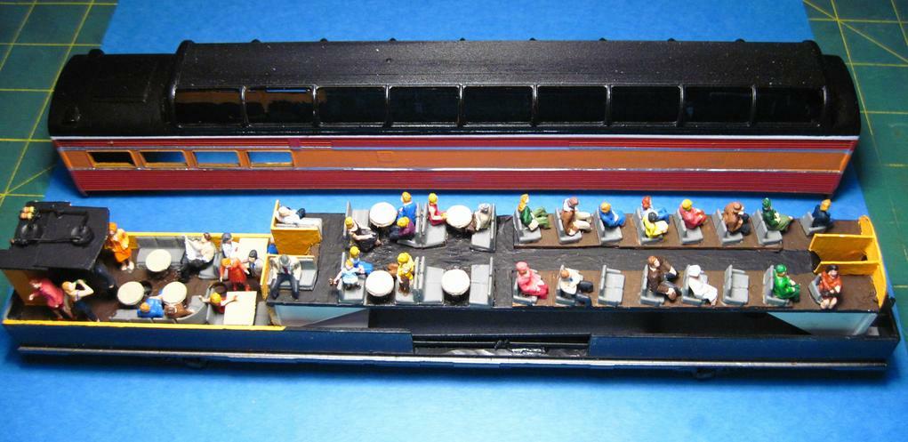 I make my own seats on the radial arm saw. Take a piece of reasonbly clear pine, dado out the sitting down portion, saw the “seat stick” off the board, and cut it up into seat size sections. Paint and glue into the car. Add passengers. Paint the inside of the car a light color so people can see in.