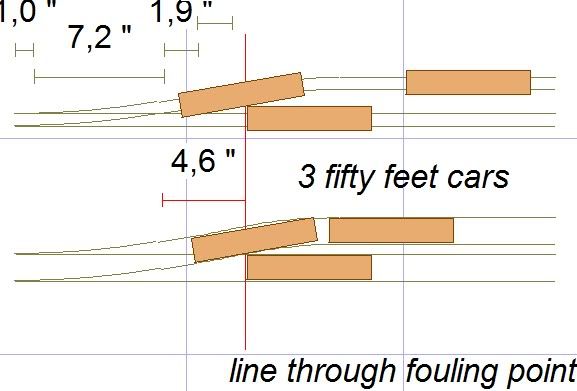 i used an atlas #6, come out at 4.6" . You’d better keep some extra space…how much is up to you, but…I made this drawing with 50 ft cars. If you are using longer cars you fouling point will be much further away from the frog.