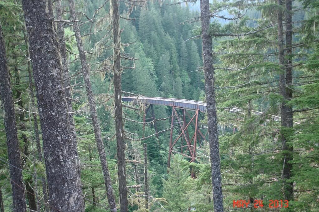 If anyone knows the history of the Kettle Valley Railway in southern BC, they probably know that vestiges of it still exist, if one knows where to look (the Othello Tunnels in Hope are the most prominent; well worth a visit). One of the cooler bits remaining is the steel trestle over Ladner Creek. This span is 550 feet long and (roughly) 200 feet high. It was built in 1916, upgraded in 1950(ish), and abandoned in 1959.