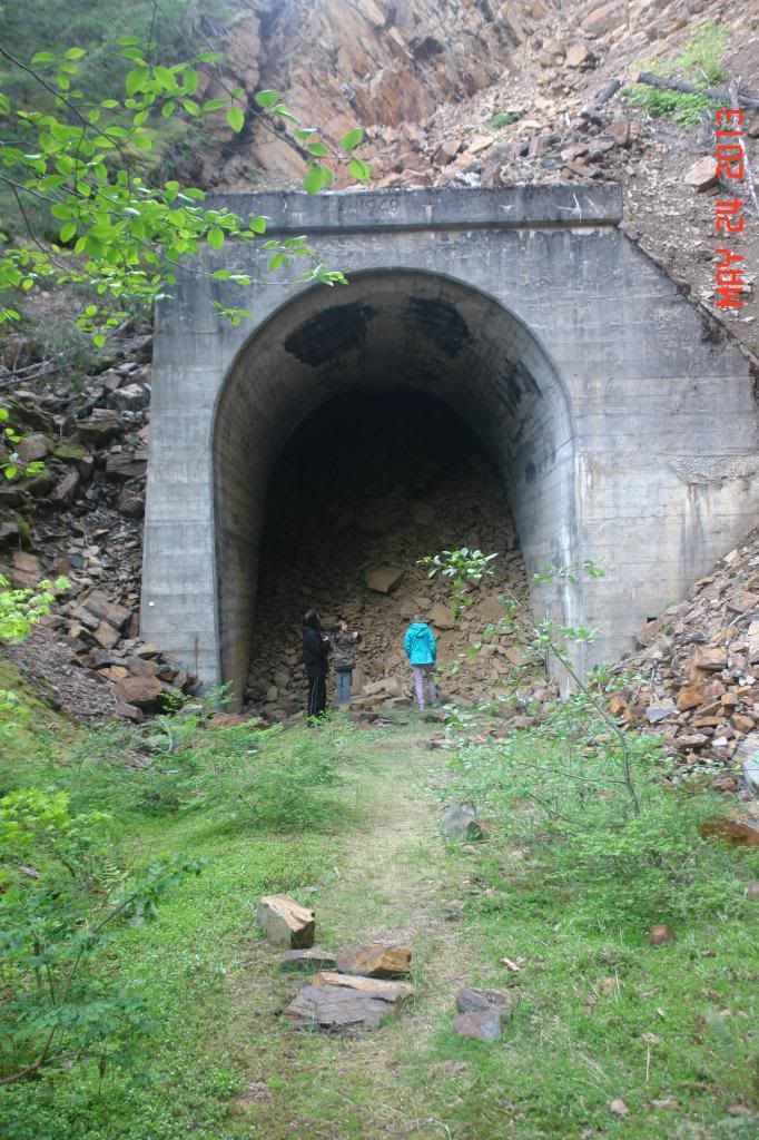 Tunnel #8, 184 feet long; the foot of the trestle is at the other end. All the remaining tunnels on the Coquihalla Sub were collapsed in the 60’s in the name of public safety. The only way forward from here is up and over, to the left of this photo.