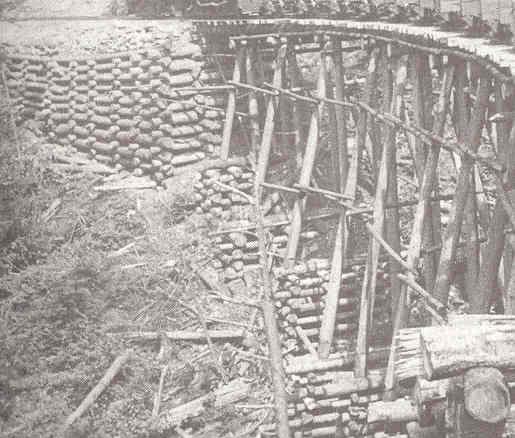 David: Here’s part of a photo showing an early 20th century trestle with some pretty impressive log bulworks. Built by a logging road with a short life expectancy, they were not designed to be long-lasting. Still, it might be helpful.