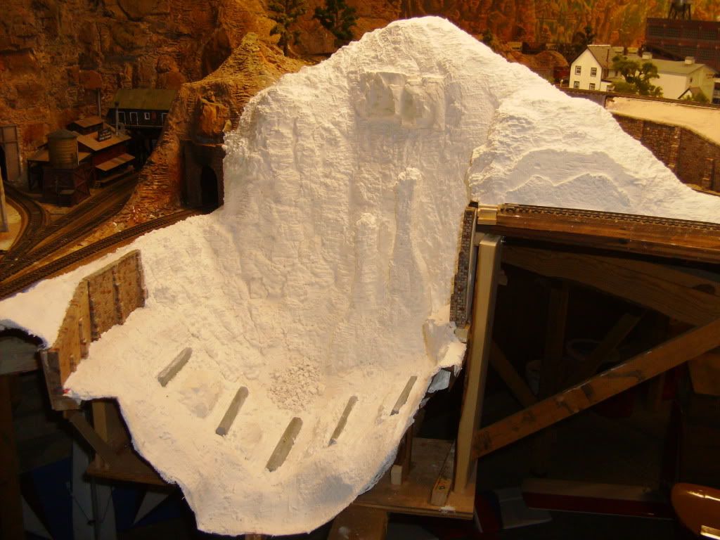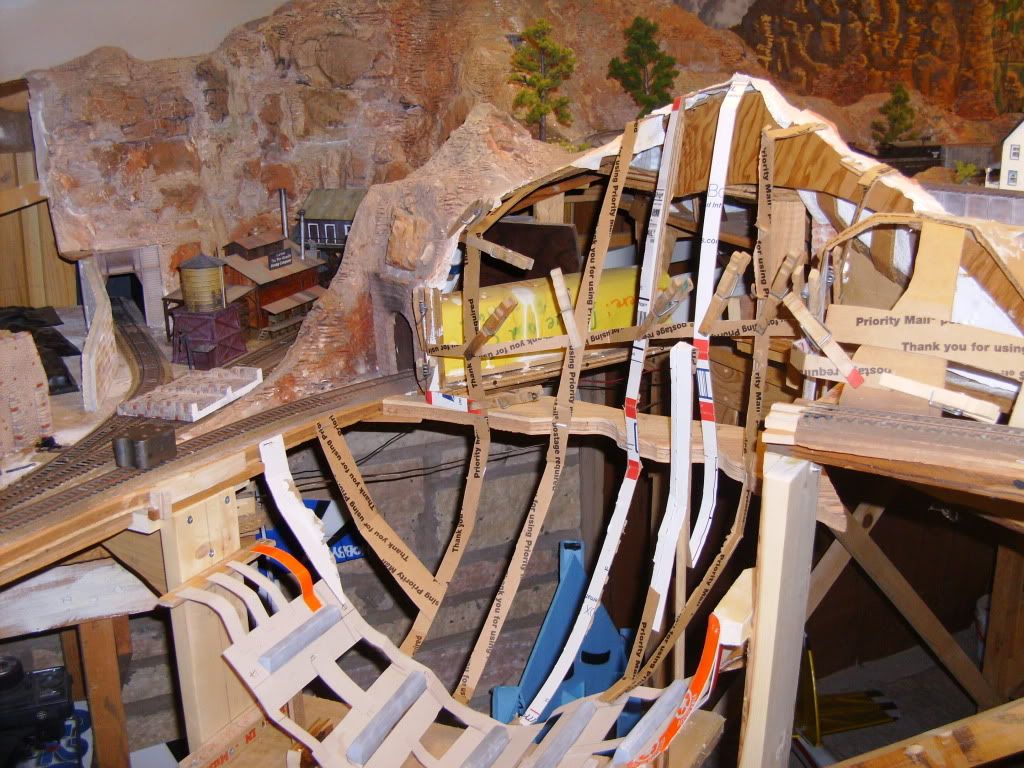 My method of building up my ground surface is to use cardboard strips cut to about one inch wide and interwoven in cris-cross fashion, stapled and/or glued to wood supports. This gives me the basic shape of the terrain and allows me to see what things will eventually look like and allow easy changes if needed. I then cover this cardboard lattus work with two layers of plaster cloth. This in turn is covered with sculpt-a-mold as the surface layer over the plaster cloth. I love Sculpt-a-mold as it takes a while to set, is very workable and easy to carve into what ever shape is desired.