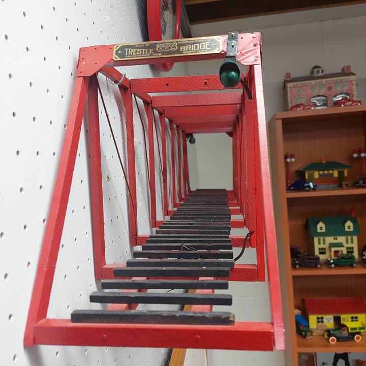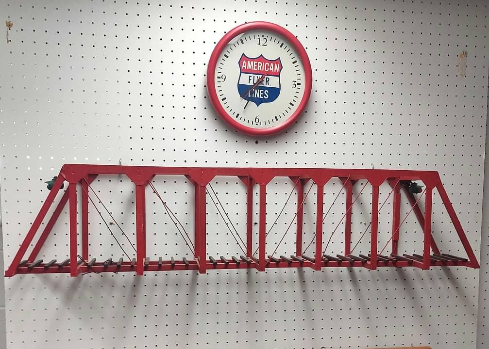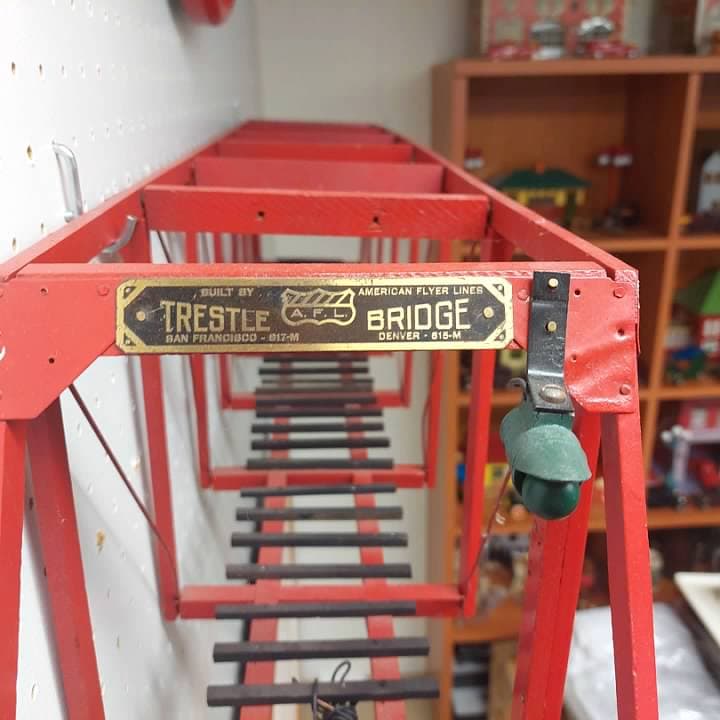 It measures approximately 42" and has a brass plate identifying it as a Trestle Bridge and giving the mileage to San Francisco and Denver. It has a fixture from a crossing signal mounted at each end.