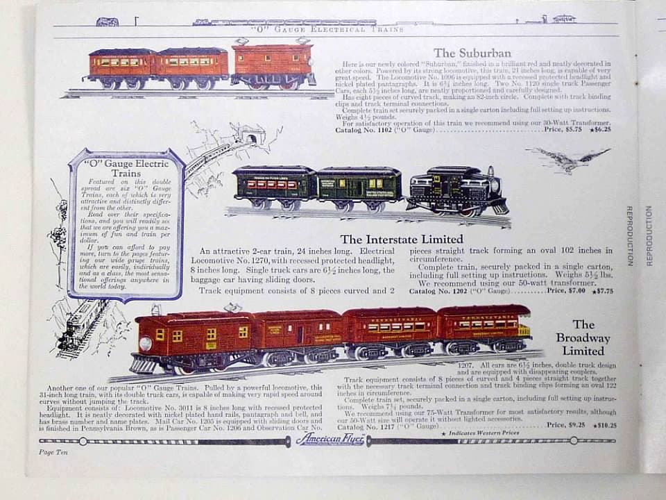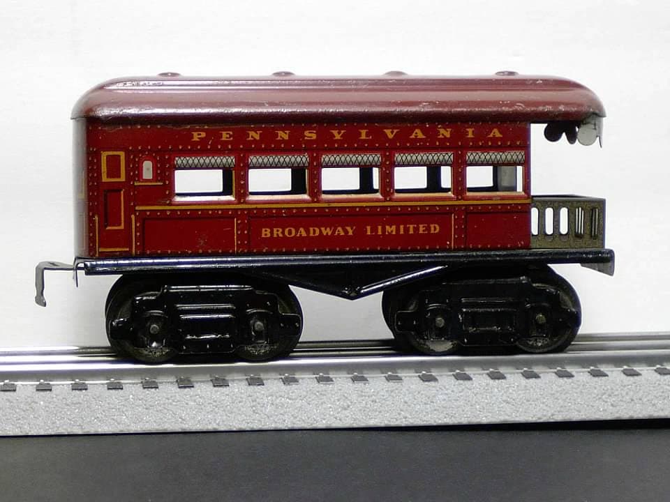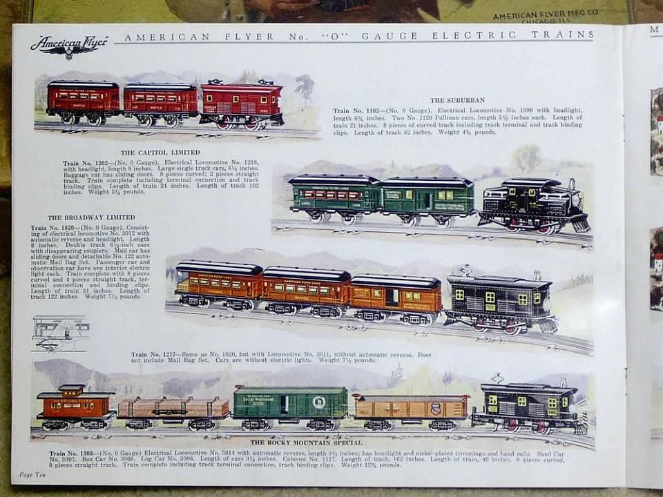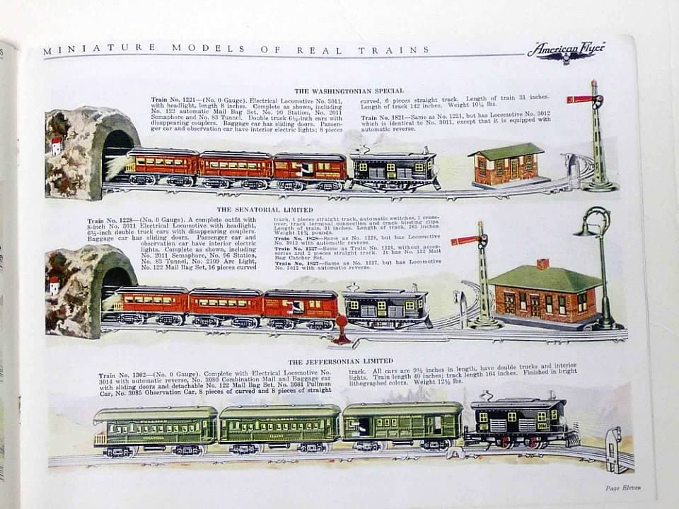 The catalog illustrations in 1926 show black roofs on the engine and cars. Cars similar to the second set are shown in the catalog as coming with The Washingtonian Special and The Senatorial Limited.