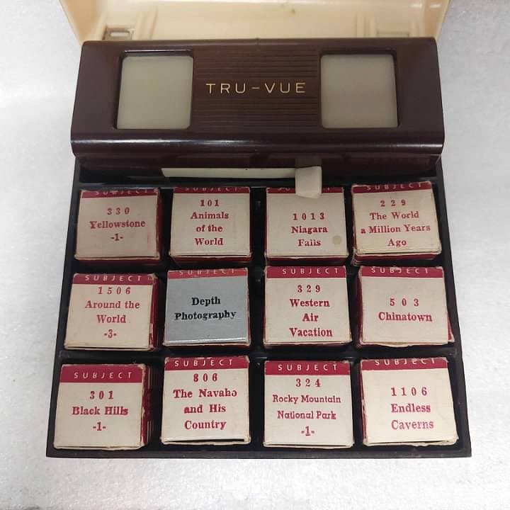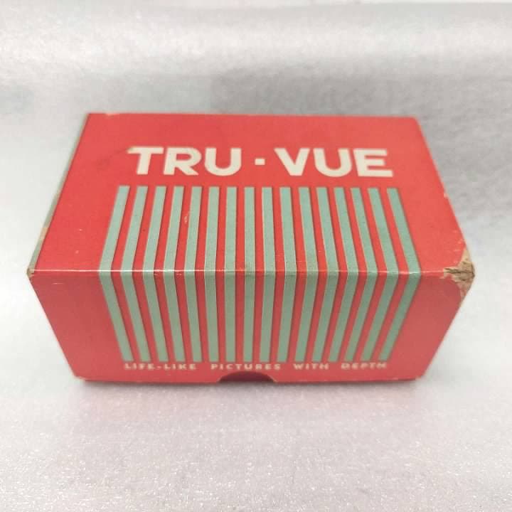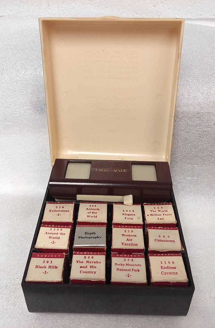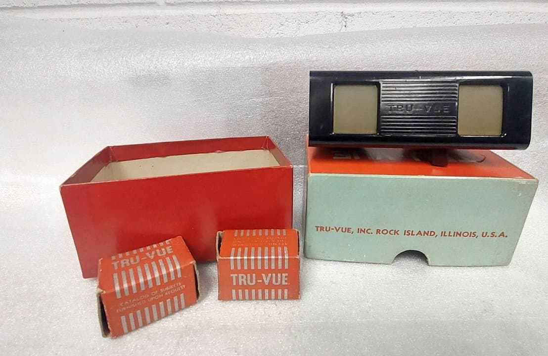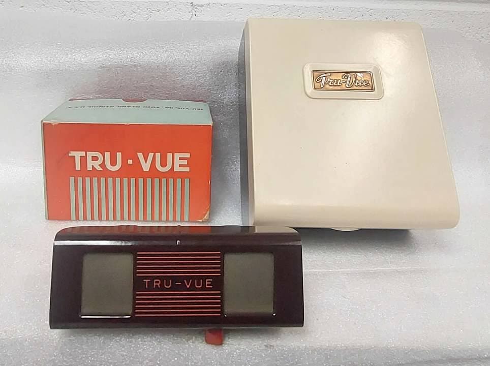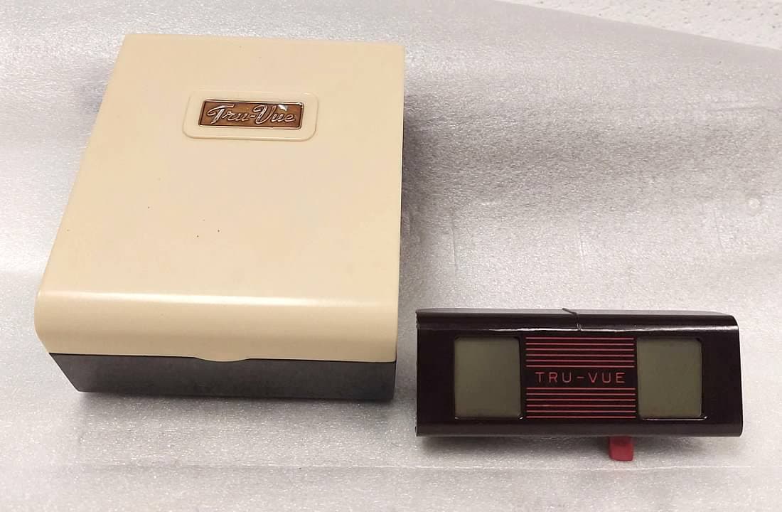A forerunner of View-Master, the Tru-Vue Company manufactured 35mm stereoscopic filmstrips that fed horizontally through a special bakelite viewer. When held up to light, the images on the filmstrip appeared in 3D.