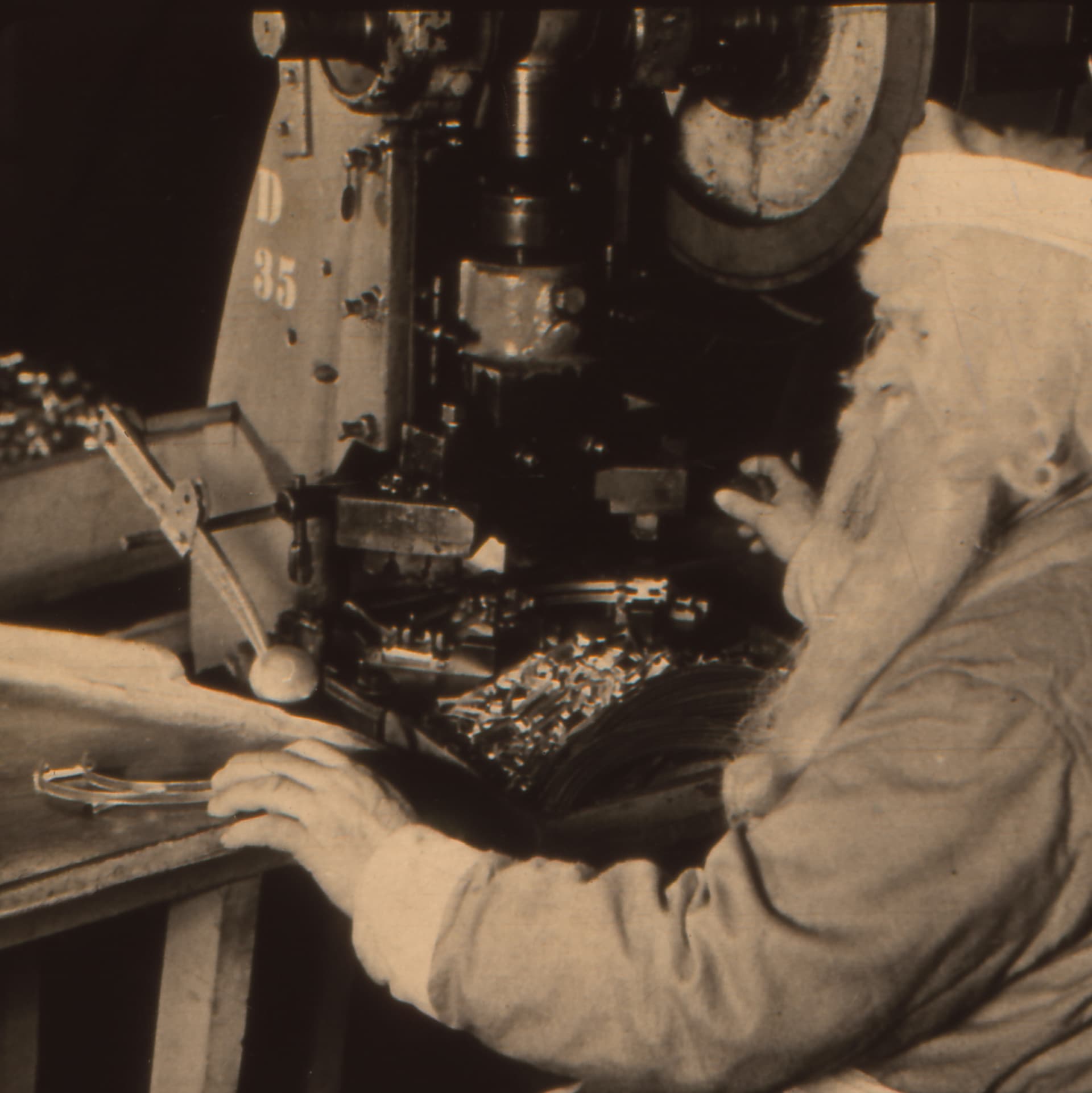 How this particular piece of machinery was used in the manufacture of American Flyer trains is not identified in this image’s caption. (In the background, at top center, two factory employees can be seen watching the photo shoot going on.)