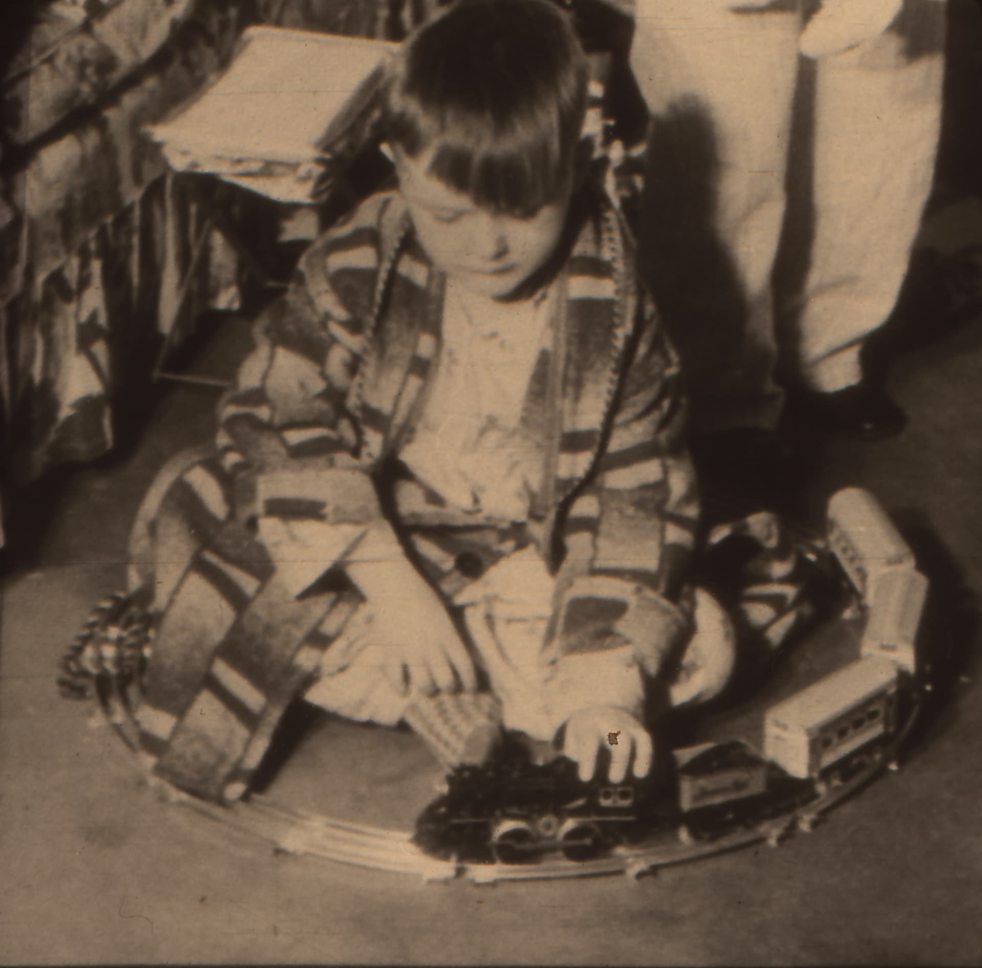 Sandy’s Railroad shows a young boy giving a tour around his model railroad. It features what I think are 1940’s Lionel trains and many hand made buildings and scenic items.
