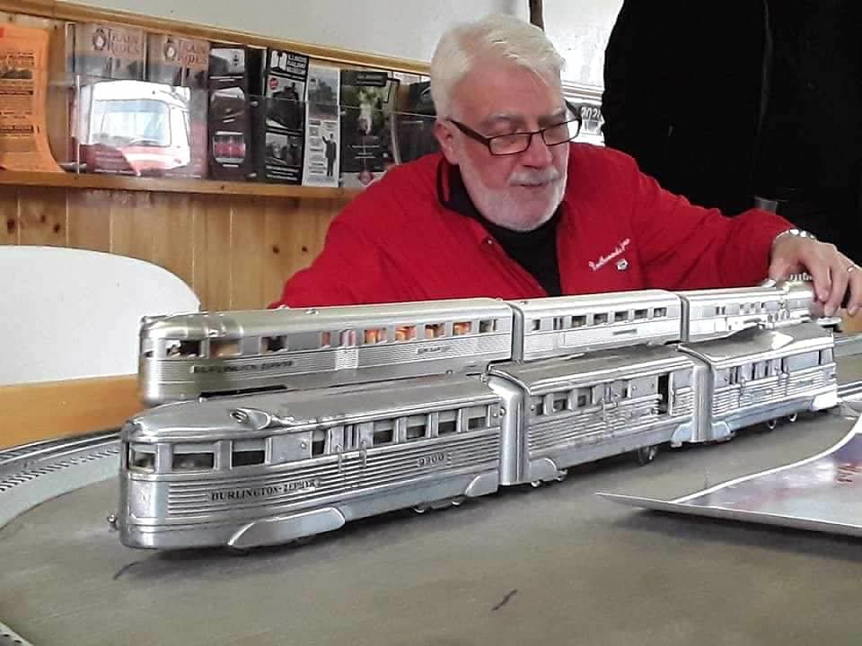 This is a photo of an American Flyer Zephyr and the MTH version of the Mark Twain Zephyr at an open house for the Mark Twain Zephyr in Trego Wisconsin at the Wisconsin Great Northern railroad back in May of 2021.