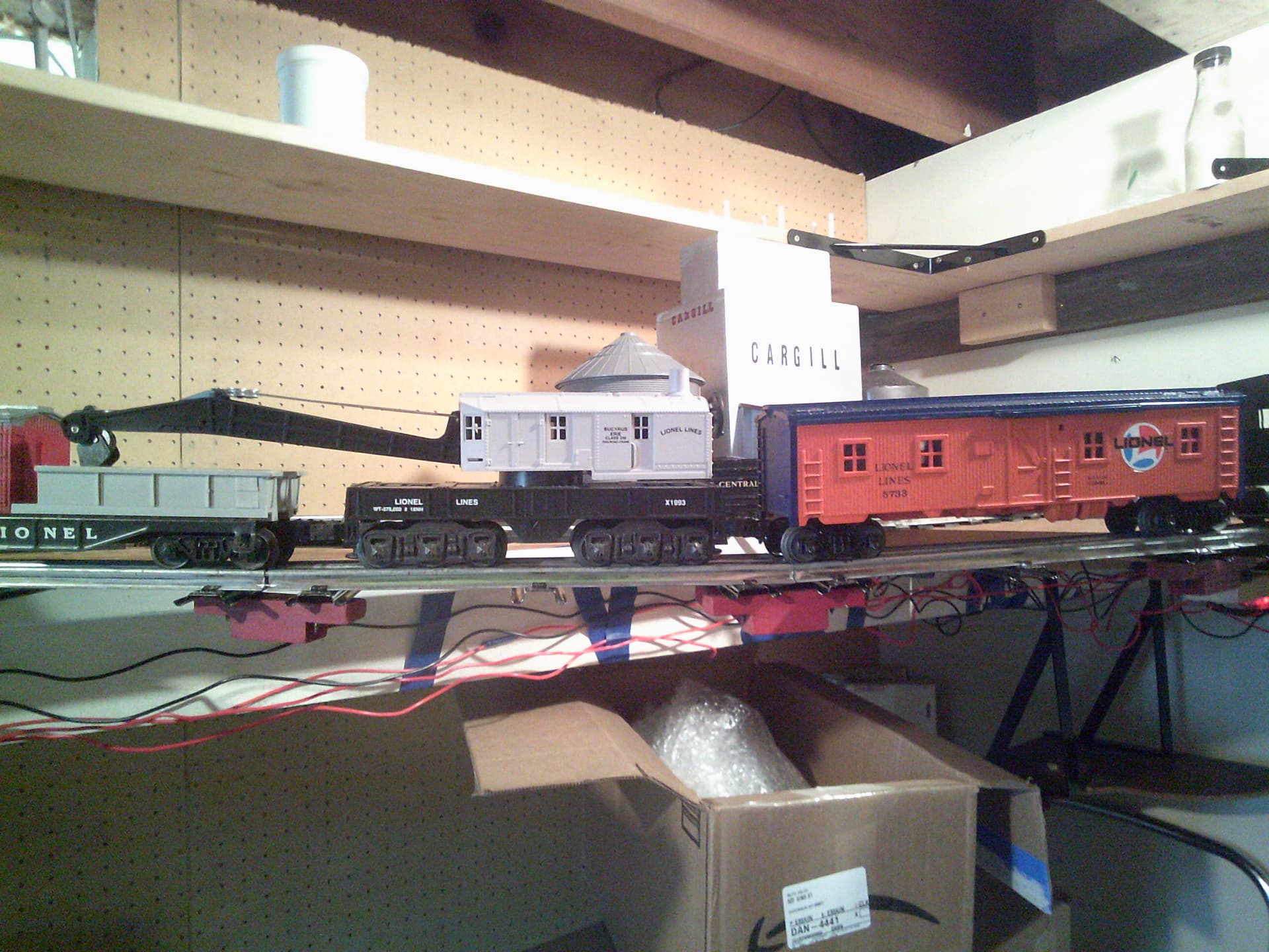 As you can see, I finally picked up a crane–a nice six-axle one too–to go with my old work caboose. I also got a bunk car while I was at it. I got extra lucky in that both the crane and the bunk car are in Lionel Lines colors; perfect for the Lionel & Marx Railroad!