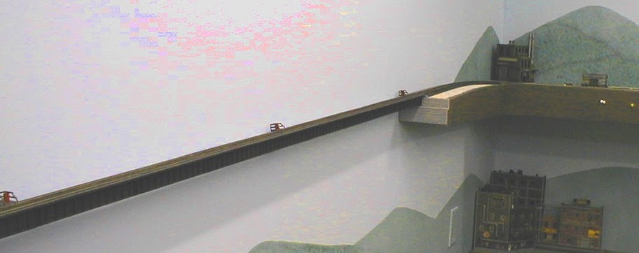 At the back wall, the shelf goes free standing (on wall brackets). The face will have some type of scenery skirt. maybe a block wall or a stone cliff. The depth of this scenery skirt will probably be 4 to 6 inches starting at track level. Once it hits the second door (on the right), the track then goes out on a bridge. Long stone pillars will be completed that reach down to the lower layout level.