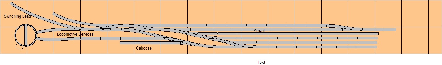 This is a terminal yard for west bound freight traffic which enters stage left; nothing continues to the east (stage right). Traffic enters engine head-in; while I have track to the upper left, this is on a 2% incline down into the yard, and shares space with two other lines.