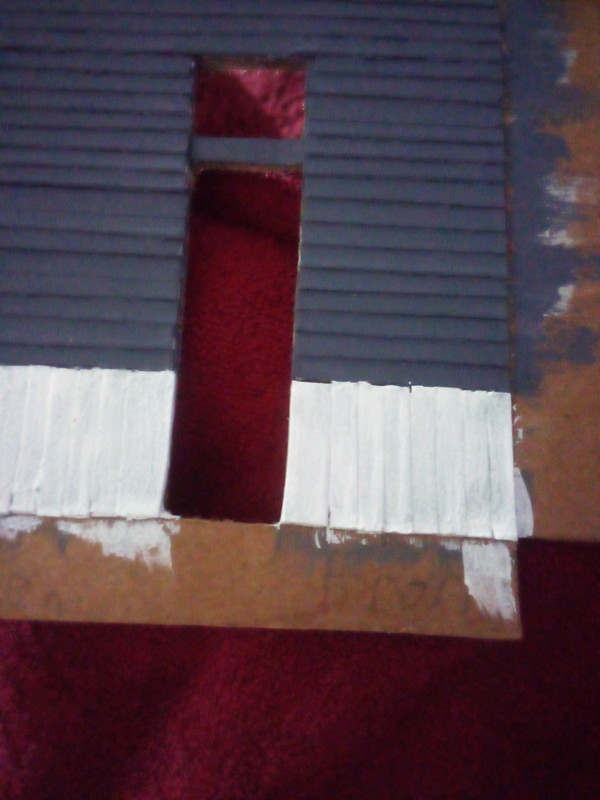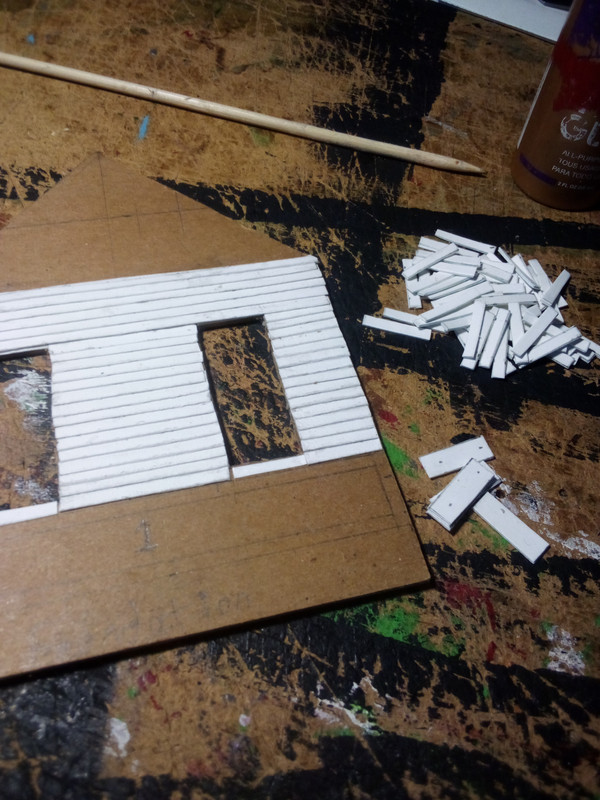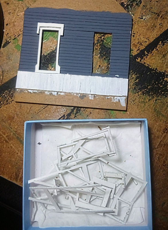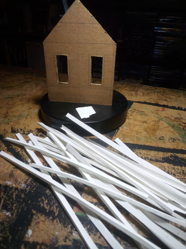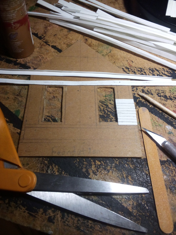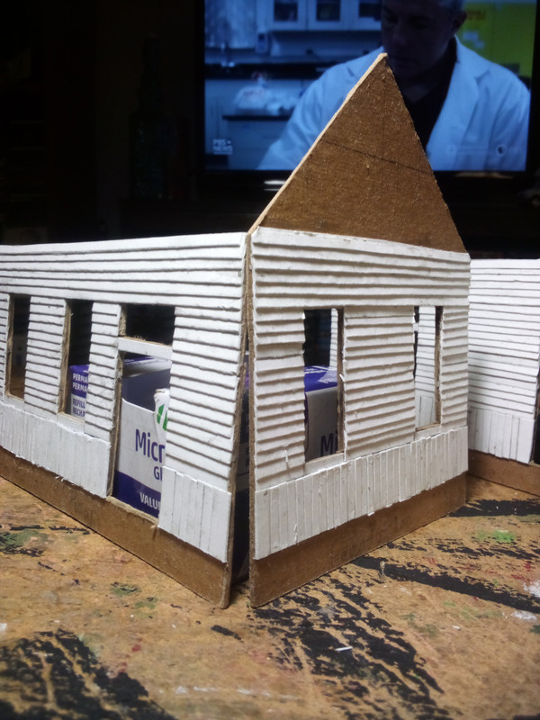 After taking a break to remove the Christmas tree from my living room, I started experimenting with the one piece of the model I have never done before: creating convincing dimensional siding from strips of cardstock. I went with 2 layers of 65 pound card and the overall effect is pretty good.