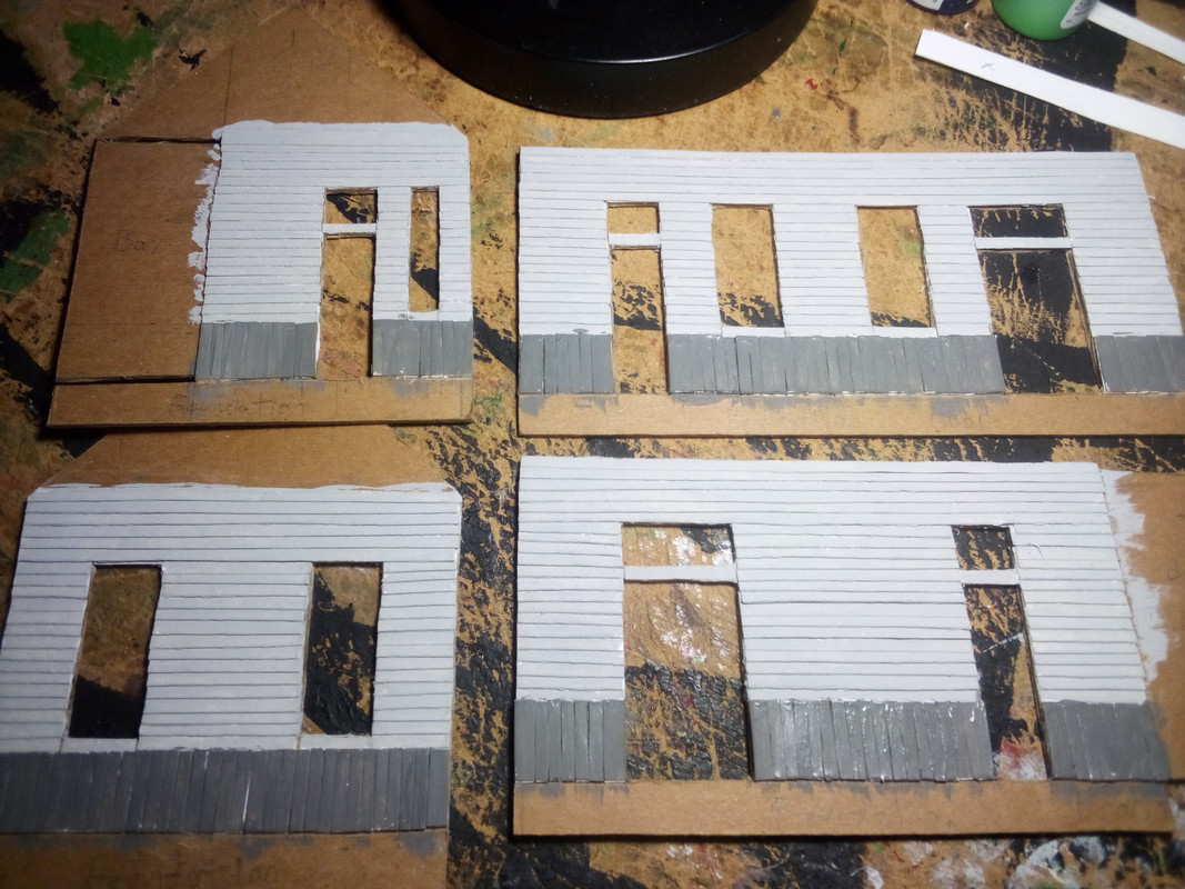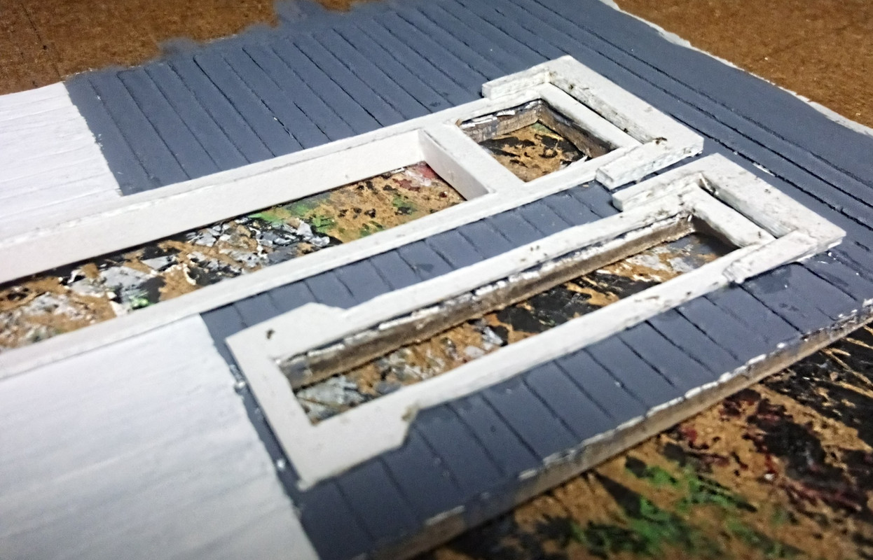 The wall on top left faces the track. The blank areas are for the bay window. The next step is to measure, cut and install narrow strips of cardstock inside the window, door and transom openings. The window panes and doors will be separate pieces.