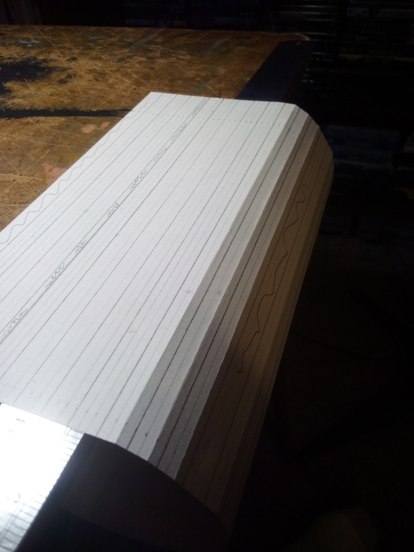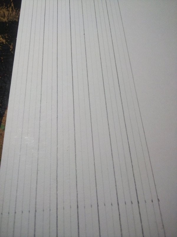 To do this I first measured 3 segments 1/8 of an inch wide and drew the lines. 1 for scoring, the next for placement of the next slat, and the third line for cutting. This allows an overlap from one slat to the next