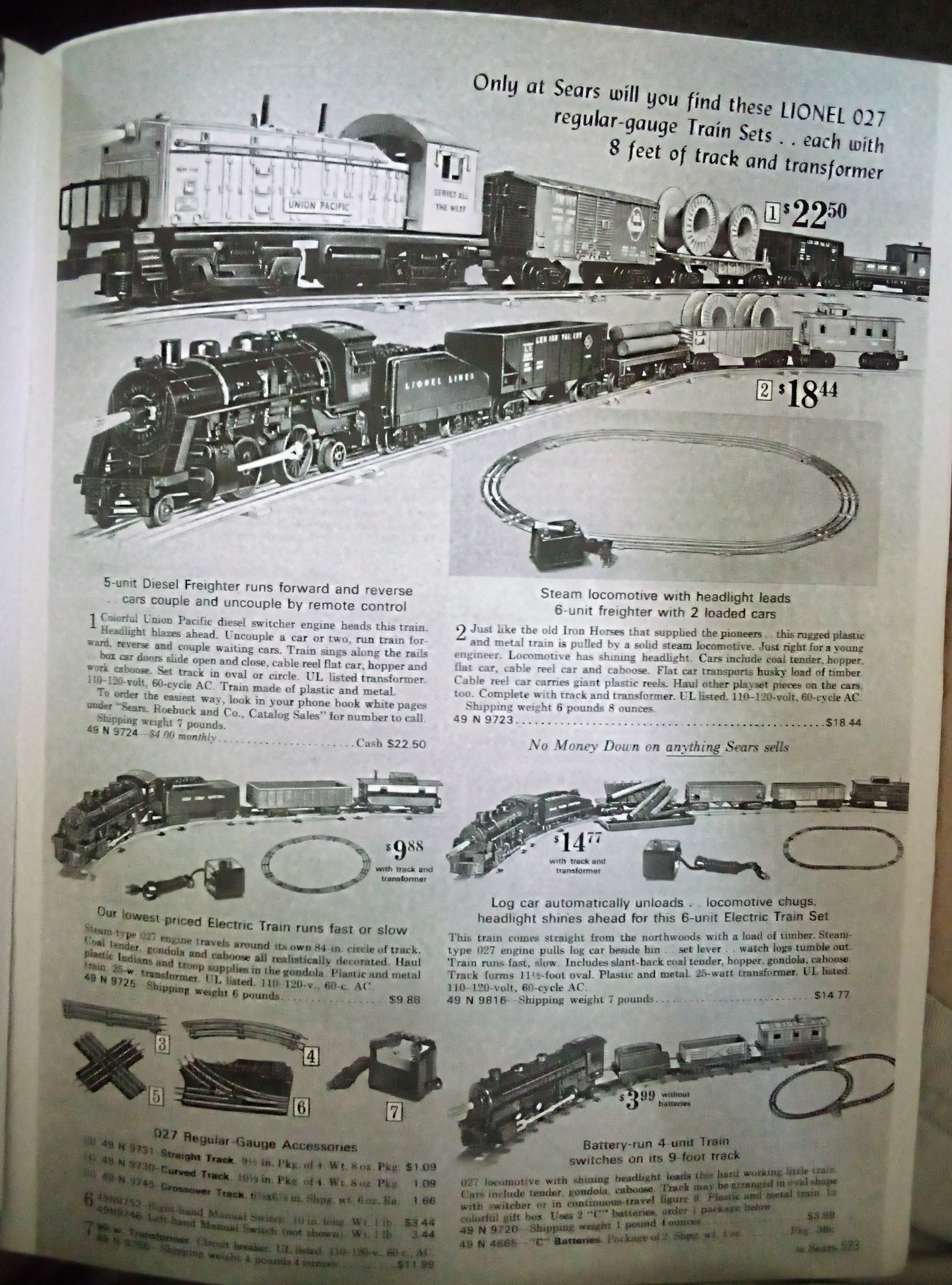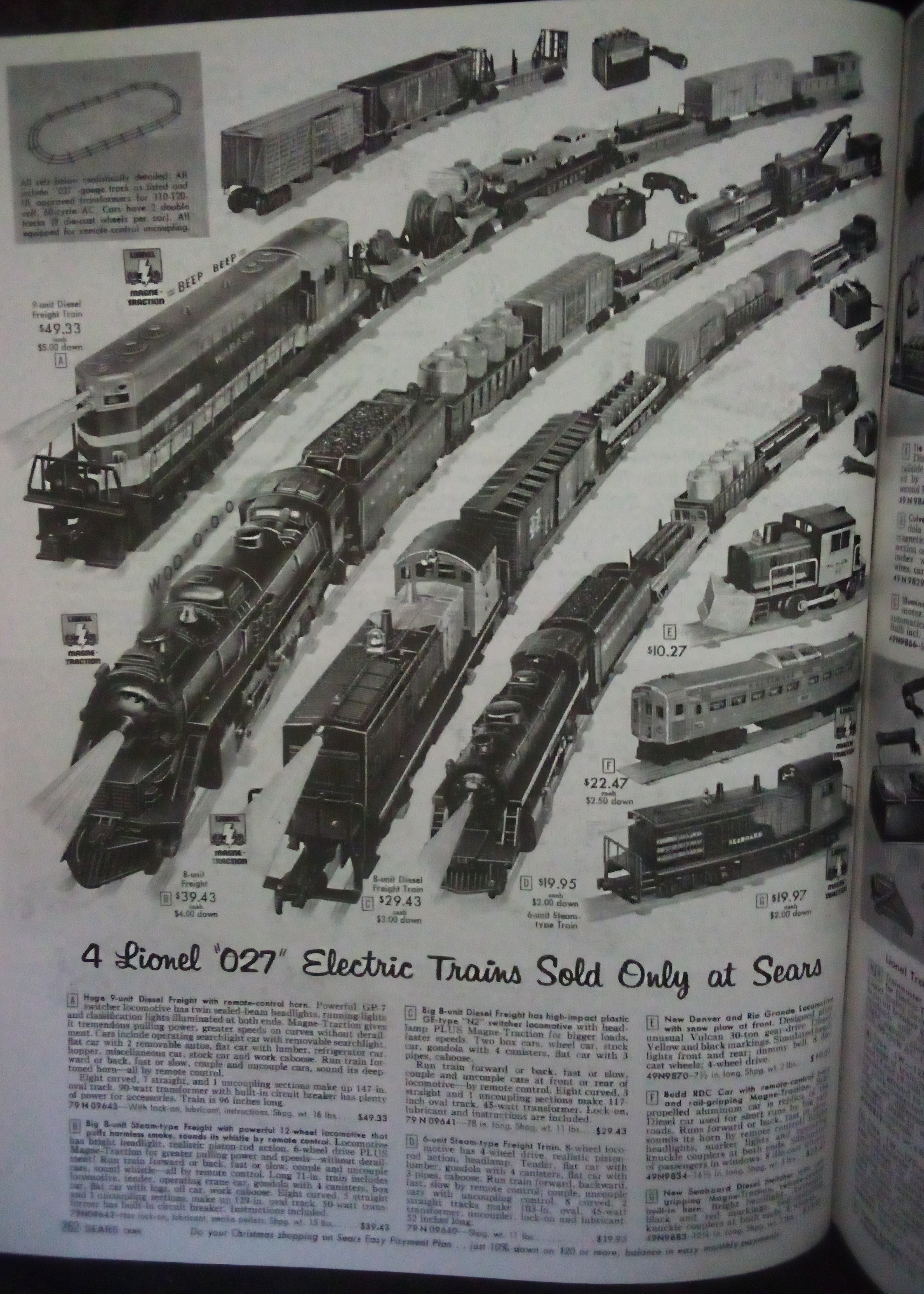 Despite focusing on Lionel promotional outfits from the 1960-1966/67 time period, the book does begin with an overall history of Lionel’s promotional outfits (as well as some mention of Gilbert and Ives), written by Roger Carp. According to that section, it seems that there was a significant gap period between the prewar era, and the mid/late 1950s, where Lionel wasn’t really doing promotional outfits. Lionel was, apparently, supplying outfits to Sears during this time, which had unique set numbers in the Sears catalog. But according to the text in the book, none of these outfits differed in contents or pricing from what Lionel had in their own catalog. Roger Carp’s piece generally sums up that we just plain don’t know much of anything so far, about the Sears sets from this time period, besides what’s shown in the Christmas catalogs. Were they sold in special Sears packaging, or normal Lionel boxes? Did they have the Sears set number, or the Lionel set number? Did Lionel’s number for the set differ from the catalog set? The answers to these question just haven’t surfaced.