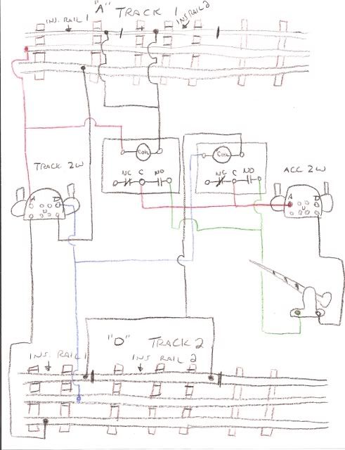 Furthermore, since 1 track is Track A, the other Track B, providing “Power” to the relay brings up a question, if the relay is powered from the track, then the + from both tracks would be needed to connect to the + of the relay. Now this would cause for the two tracks to be shorted together, thru the + connection at the relay. Seems NOW that 2 relays are required?