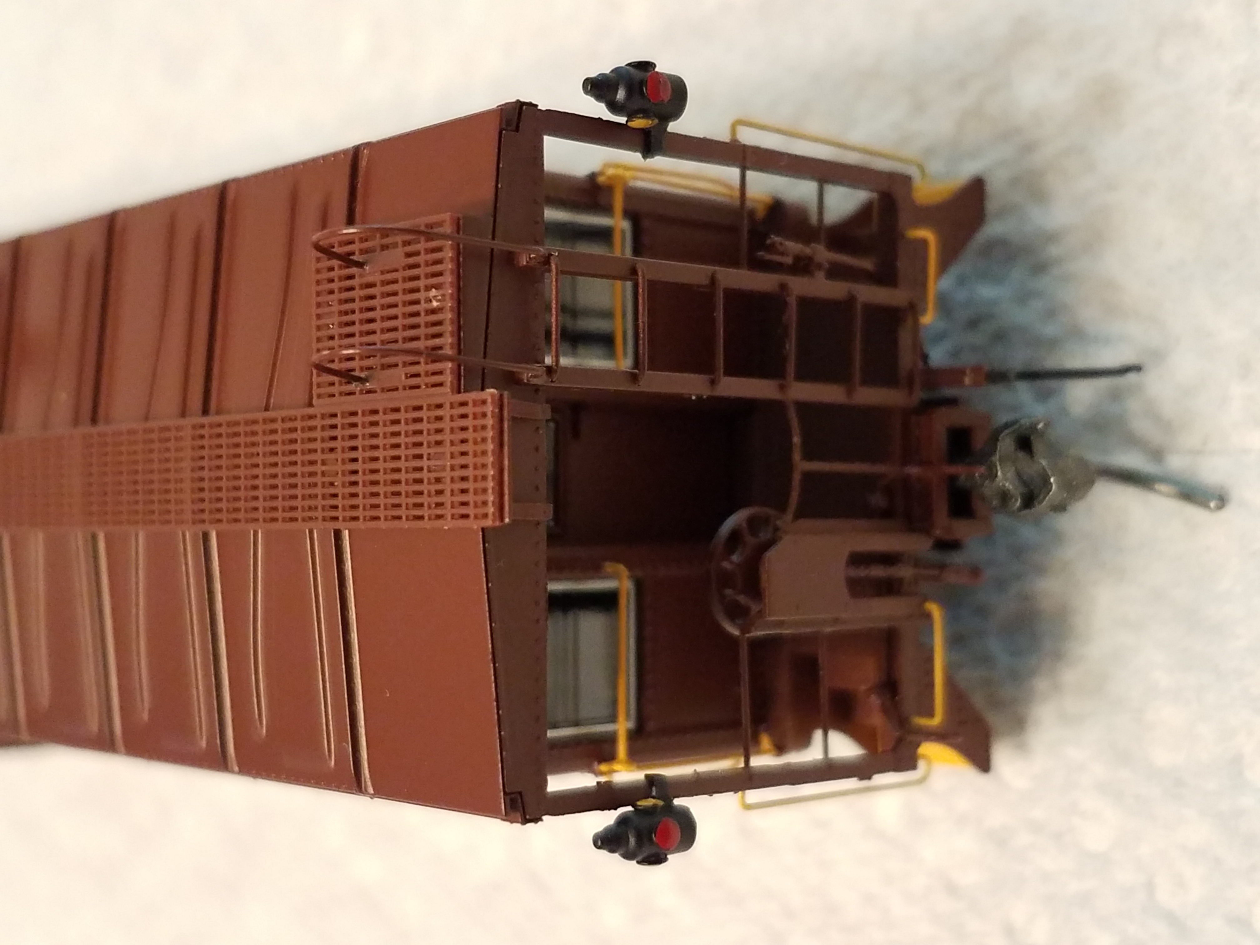 The roof walk appears to be etched metal (vs plastic) and the caboose roof is visible through the grating: