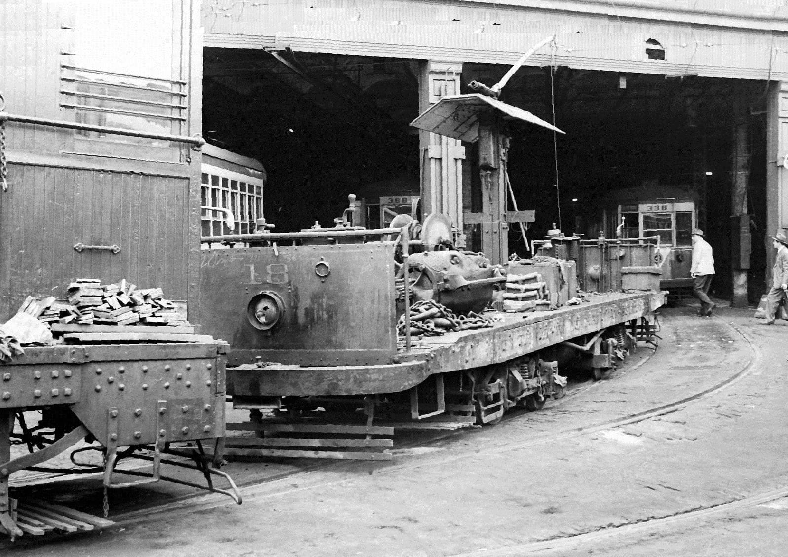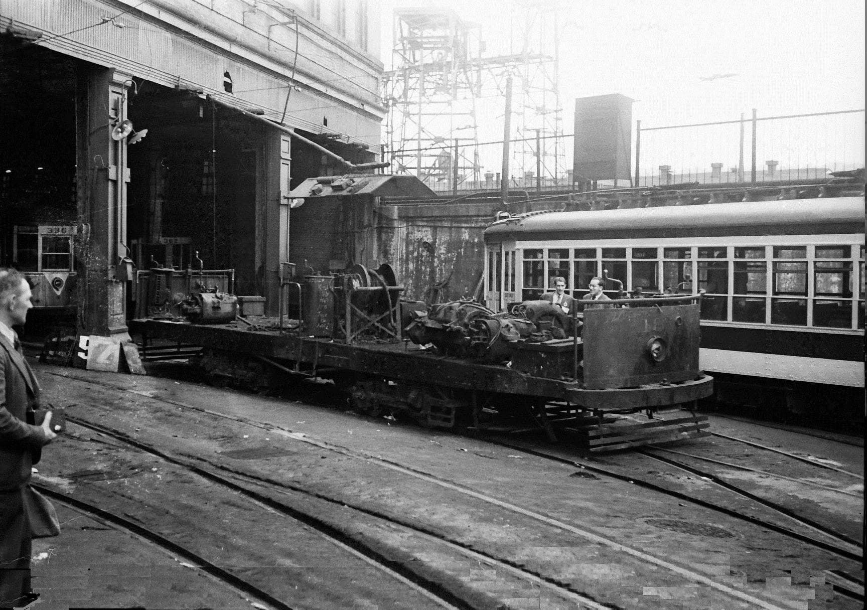 Here is one of the two, around 1960, working on the “change-ends” track for the Type 5s running from Watertown and Belmont to Harvard Square, without continuing to North Cambridge or Arlington Heights. Formerly also Harvard Square bypass-the-tunnel tracks and connection to the Massachusetts Avenue Line to MIT and Massachusetts Station, Boston.