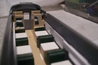 One additional step I take upon reinstalling the interior is adding window shades with long strips of styrene on each wall. After lining up the styrene strips, I make pencil marks on the spots where they will be visible from the outside then trim off between 1/8" to 1/4" to simulate the shades in different postions as in the photos below: