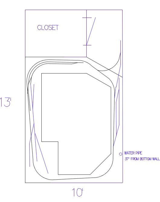 The room is about 13’ long and 10’ wide, with incoming water and pipes for the kitchen above to consider.