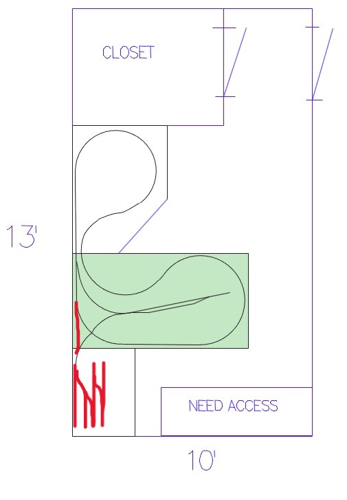 From your diagram there are two important access areas that need to remain open: The entry way into the train room and the point where the water pipes from the street enter the house. That’s good planning. You could manage an around-the-room layout (with larger curves) using lift outs at those locations. Even with R18" or R22" curves, you’ll need straight sections of track between your opposing curves to avoid “S-curves”, which can lead to derailments. The straight sections should be as large as your largest locomotive wheelbase, which - for your SD-45 - is 53’ or 7.3" (HO). I don’t see any straight sections of track in your interior curve separating them from the opposing exterior curves.