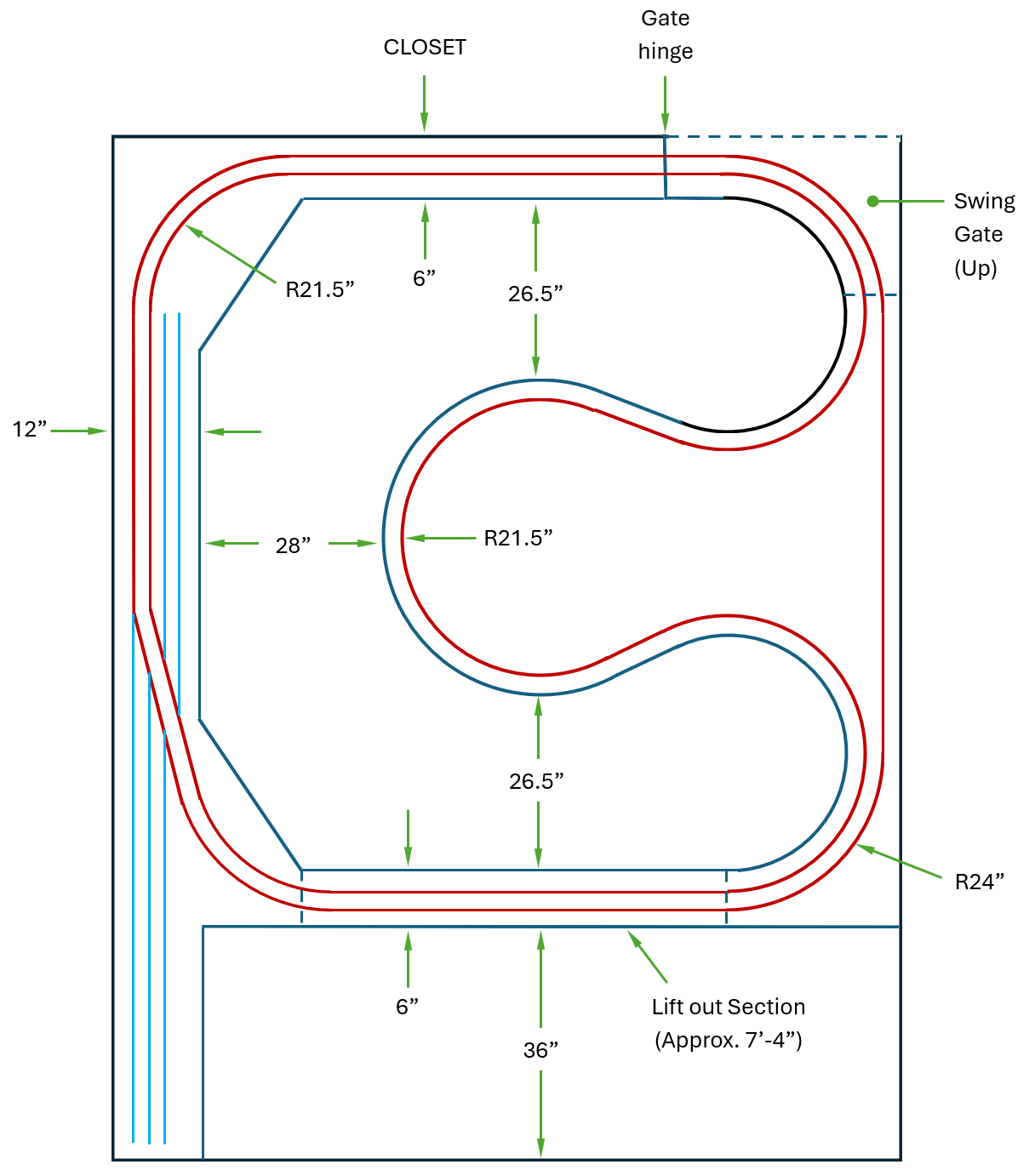 Regarding the lack of straight track to get rid of the S-bends, I just used a very simple online cad program to do this drawing. When I’ve been fooling around on the floor with the trains, I’ve always put a 9" straight in between the opposing curves. Never had a problem with the sharp curves, and I imagine that four more inches will make it good enough. But if I run it on shelves around the room, of course it could be made to 24 or 28".