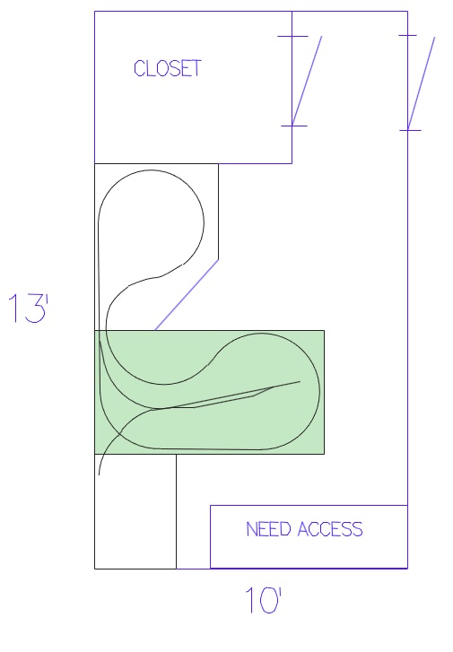 The original drawing of the room was, to be honest, not really correct; the entry to the room is actually further up along the wall, I just simplified it as I didn’t see that “corridor” as useful space. But for a wye (20" radius or something), it will do just fine. The wall to the left is about 4’ from the bottom right corner of the closet to the door.