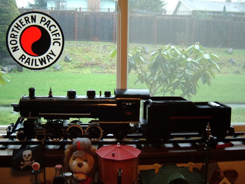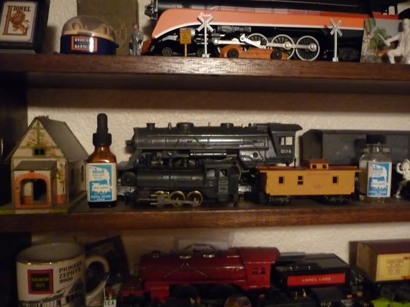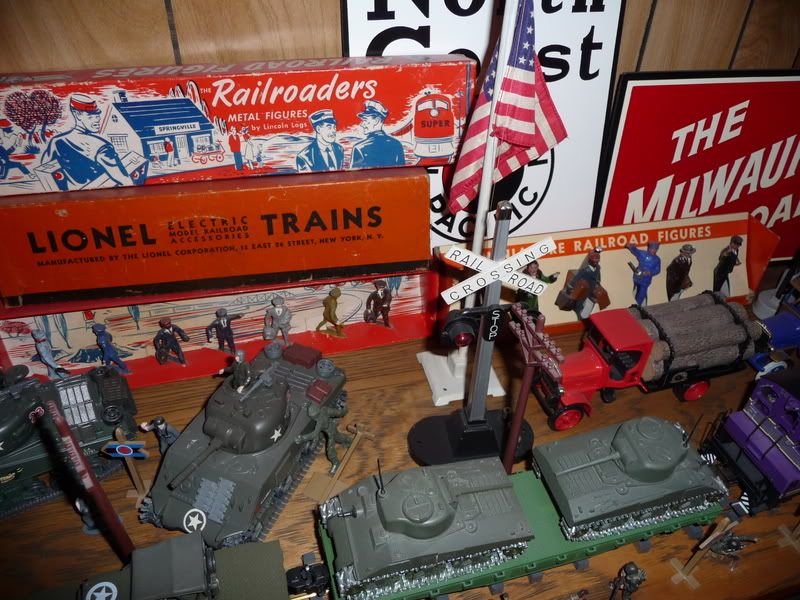Hmmm, what little things I have around usually appear on the layout somewhere - Two Xmas ornaments - a streamlined Hudson and Blue Comet engine; a train-scene magnet from a museum; lots of knick-knacks from my dad scattered around Baker Field - two airplane kits he made, little plastic cars from the 30s powered by balloons,