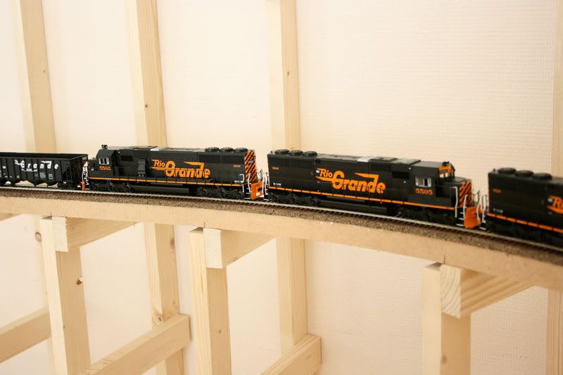 I have to admit, seeing a long train without safety net makes me extremely nervous too! My last basement layout had either space on the sides so a derailed train car would not just fall off, or in sections intended to be hidden, I provided a card board “back stop” of minimal height to fence in any errand derailed cars! Be careful, thats Rio Grande trains you have there!