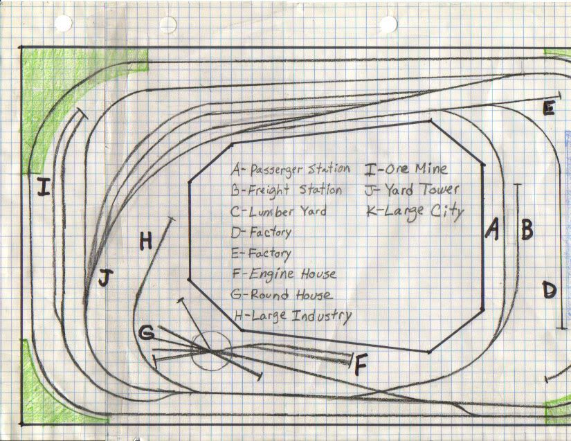 Couldn’t fit it all in one scan. Layout is 8’x15’ with a center controle pit. The outer most main line is a 2.5% grade.There will be some minor grades on the inside that I haven’t worked out yet. The green areas are mountains and tunnels.