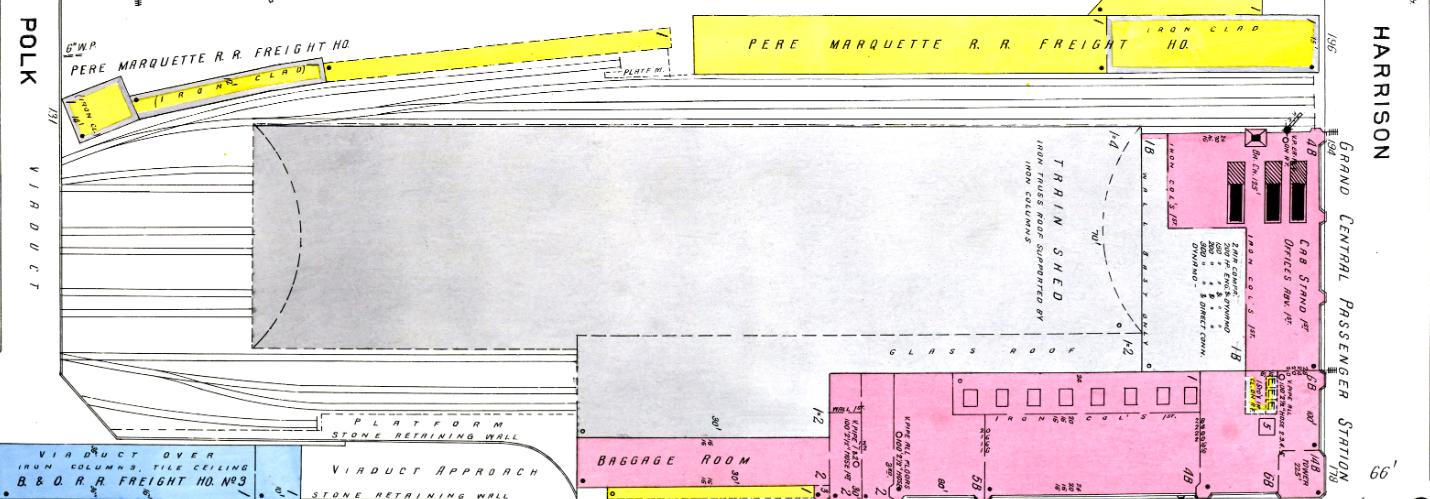 This was an early drawing of Chicago’s Grand Central Station track plan, and not much changed in the years that followed until the entire complex, station, shed and tracks, were demolished in 1971.