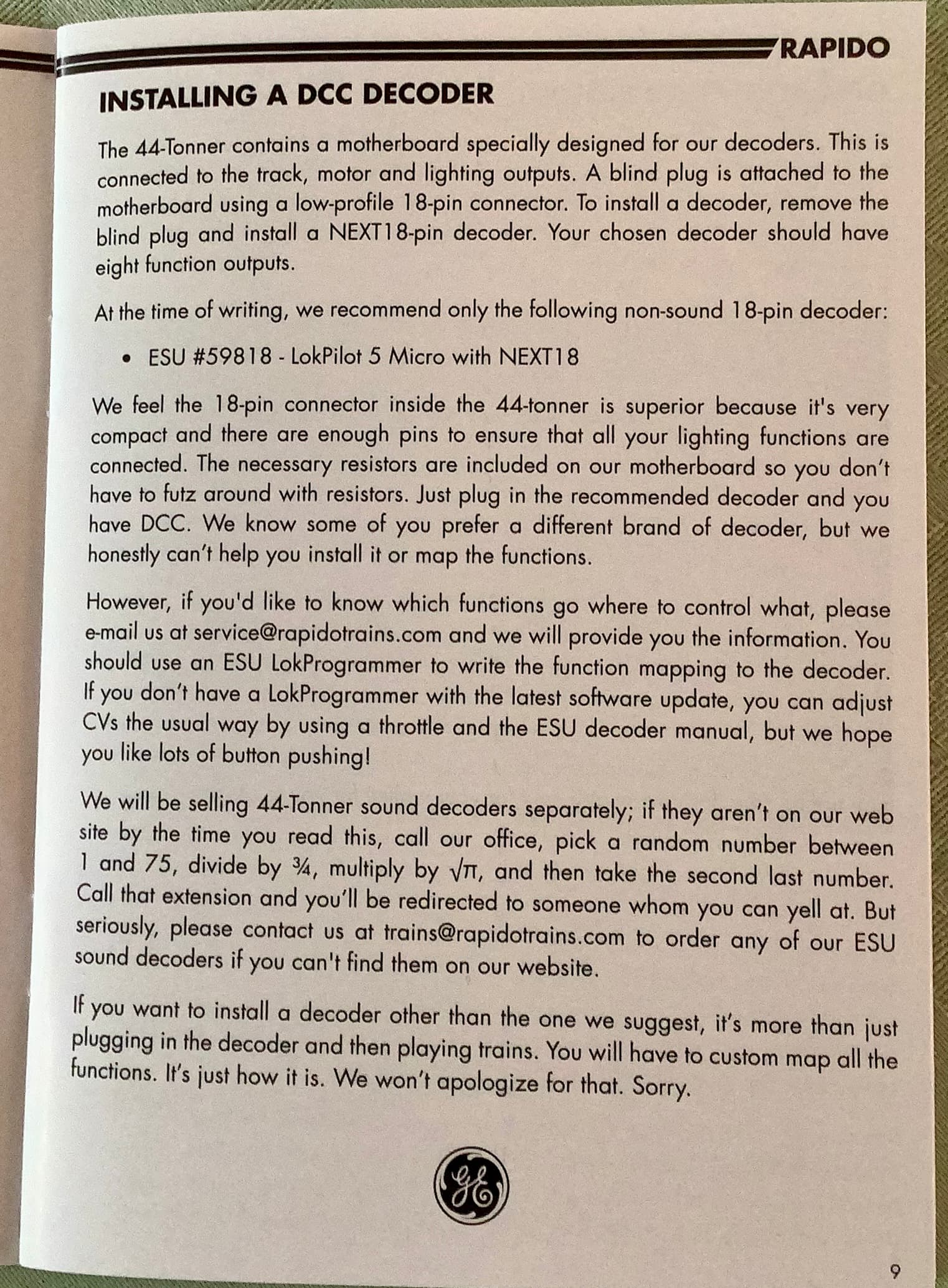 Anyone else had trouble putting a non-ESU decoder in the DC/Silent Rapido GE 44-Tonner that was released in September 2025? The page “Installing a DCC Decoder” page in the manual that comes with the loco warns against it, but I saw no warnings in the product descriptions when I ordered. Movement, horn, bell, cab chatter all worked with a Soundtraxx TSU2 N-18 installed, but I never could get the lights (that work fine on DC) to work. Nor could I change any CVs (other than the decoder’s address). A nightmare. Finally sent it to Soundtraxx who ripped out the ESU motherboard and replaced it with their N-18 Adapter. I’m waiting for it to be returned now.