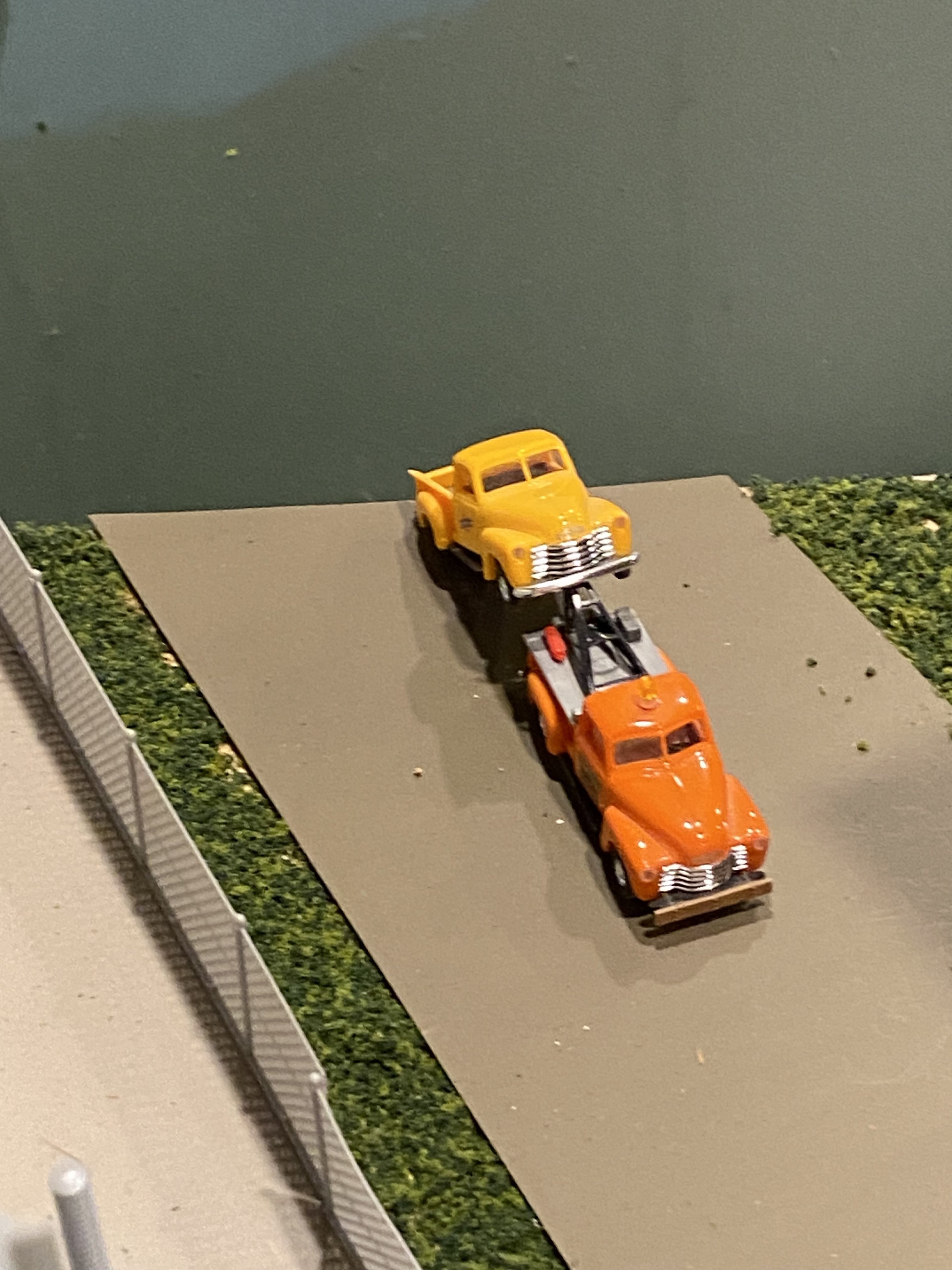 This is the work of my grandson positioning his favorite orange tow truck, preparing to dump a problematic pickup truck into the river.
