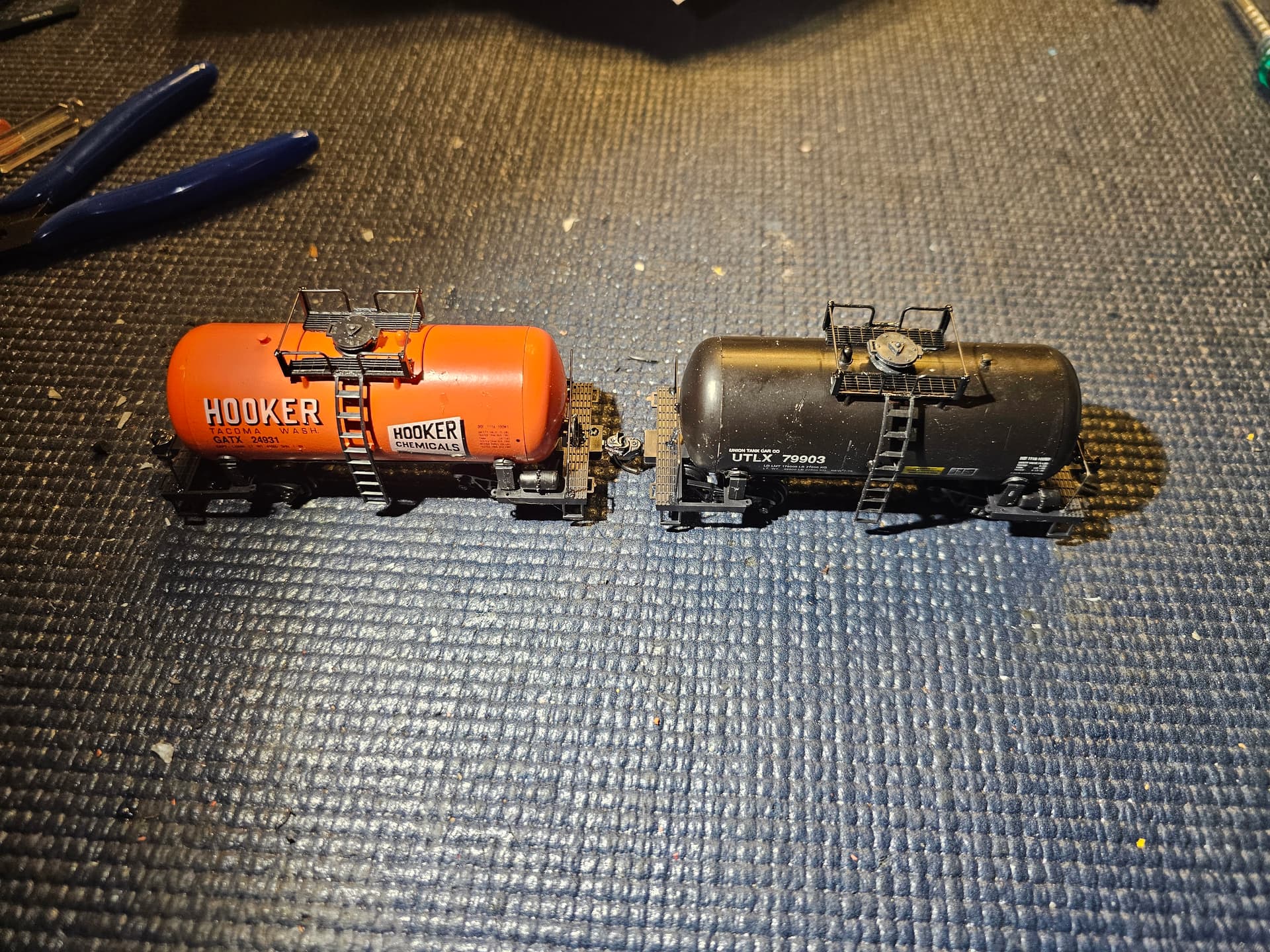 Two “mini” tank cars built from Round House kits last night. Haven’t had a chance to pit them on the layout yet.