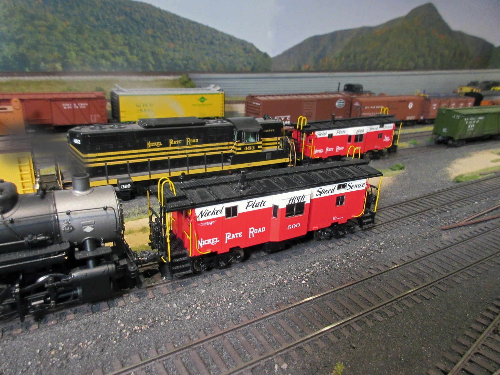 A pair of Nickel Plate “High Speed Service” bay window cabooses: