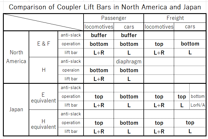 The same knuckle couplers are used in my country, Japan. However, I was surprised to find that they look a little different. So I organized them in the following table. What do you think?